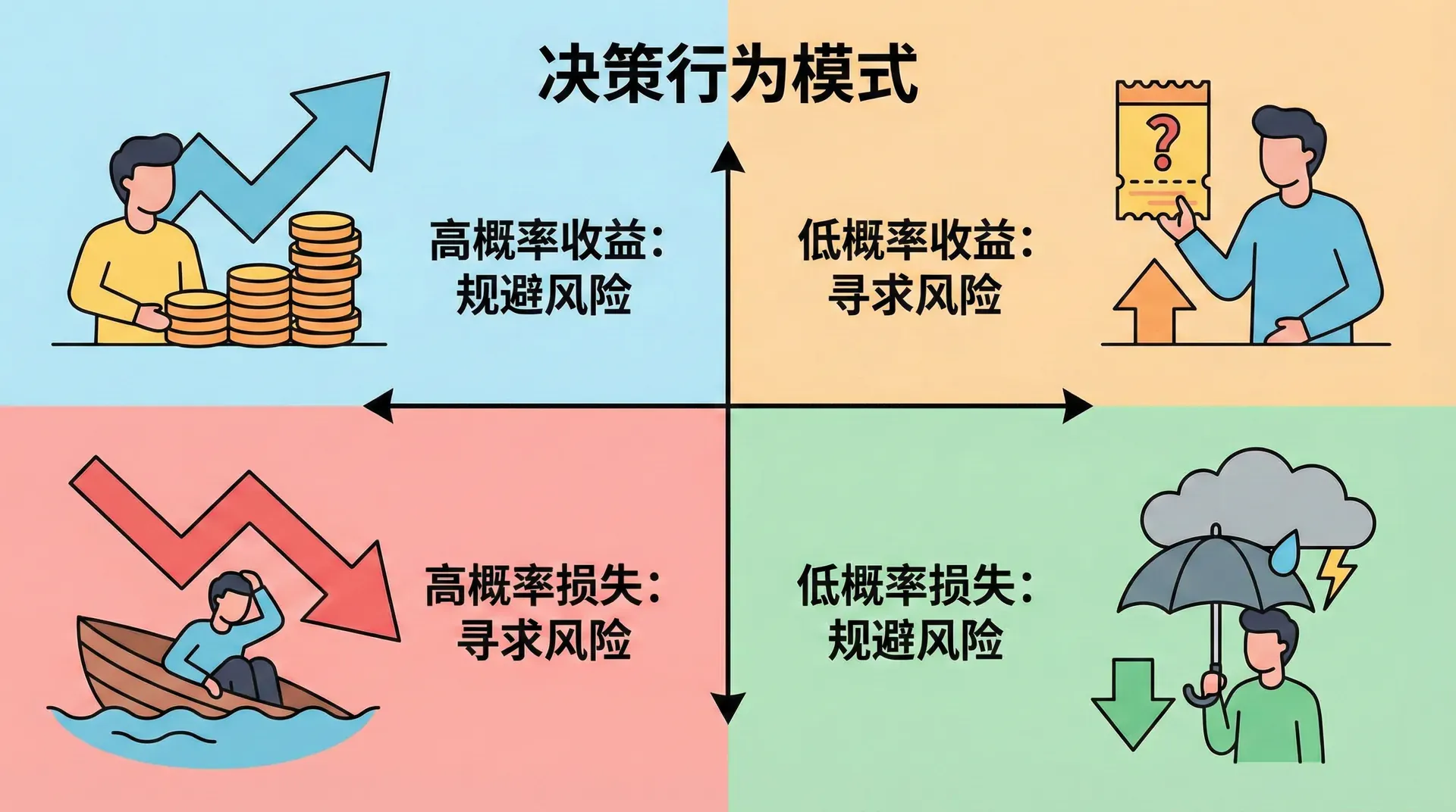 “四重模式”基于两个坐标轴:结果性质(收益/损失)+ 概率(高/低)。由此将所有决策情境分为四大象限,各有典型行为和心理态度。