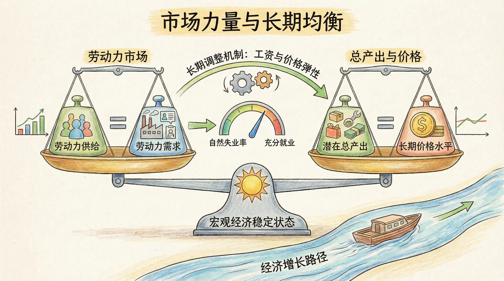 长期就业均衡指的是:“假如某一预期状态持续足够长的时间,使得与之相关的所有经济调整都完成,就业水平达到新的稳定点,此时即没有正在进行的结构性调整,也没有因预期改变而引发的用工浮动,这一最终稳定状态即为对应预期下的‘长期就业’。”