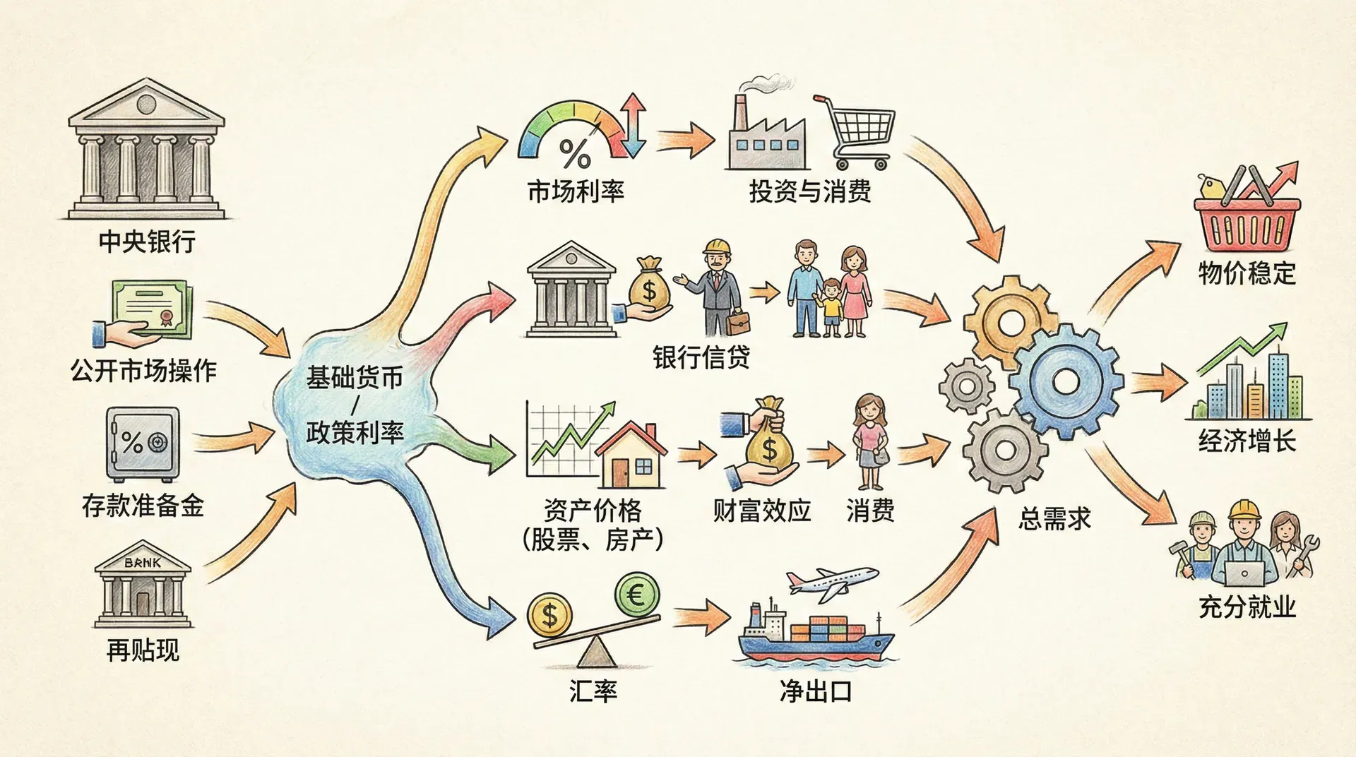 货币政策对实体经济的影响,并非一蹴而就,而是通过多重环节逐步传导。每个环节既有政策目标,也存在传导障碍。以下用一组实例化流程图加以简化说明: