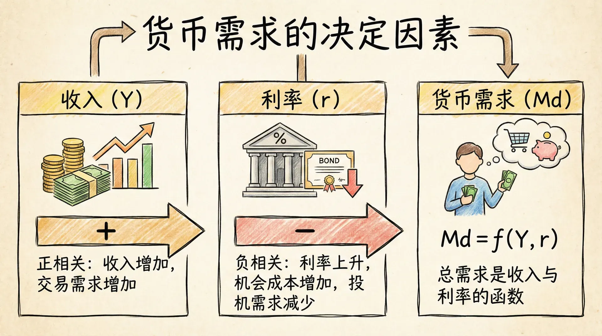 其中, 是收入 的函数,反映收入和日常交易等对货币的需求; 是利率 的函数,主要反映对未来利率变动或资产价格波动的预期,也就是“投机动机”成分。