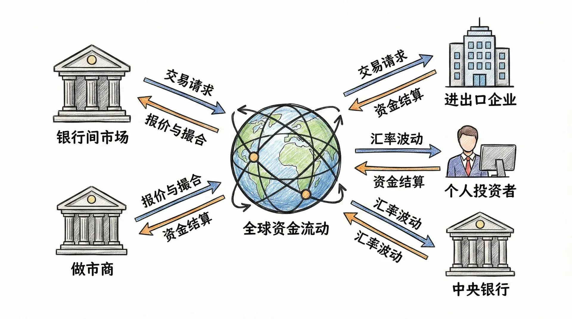 外汇市场的主要参与者可分为多类,不同角色的交易目的和影响力各异。为便于比较,下面总结了常见参与者及他们的主要功能: