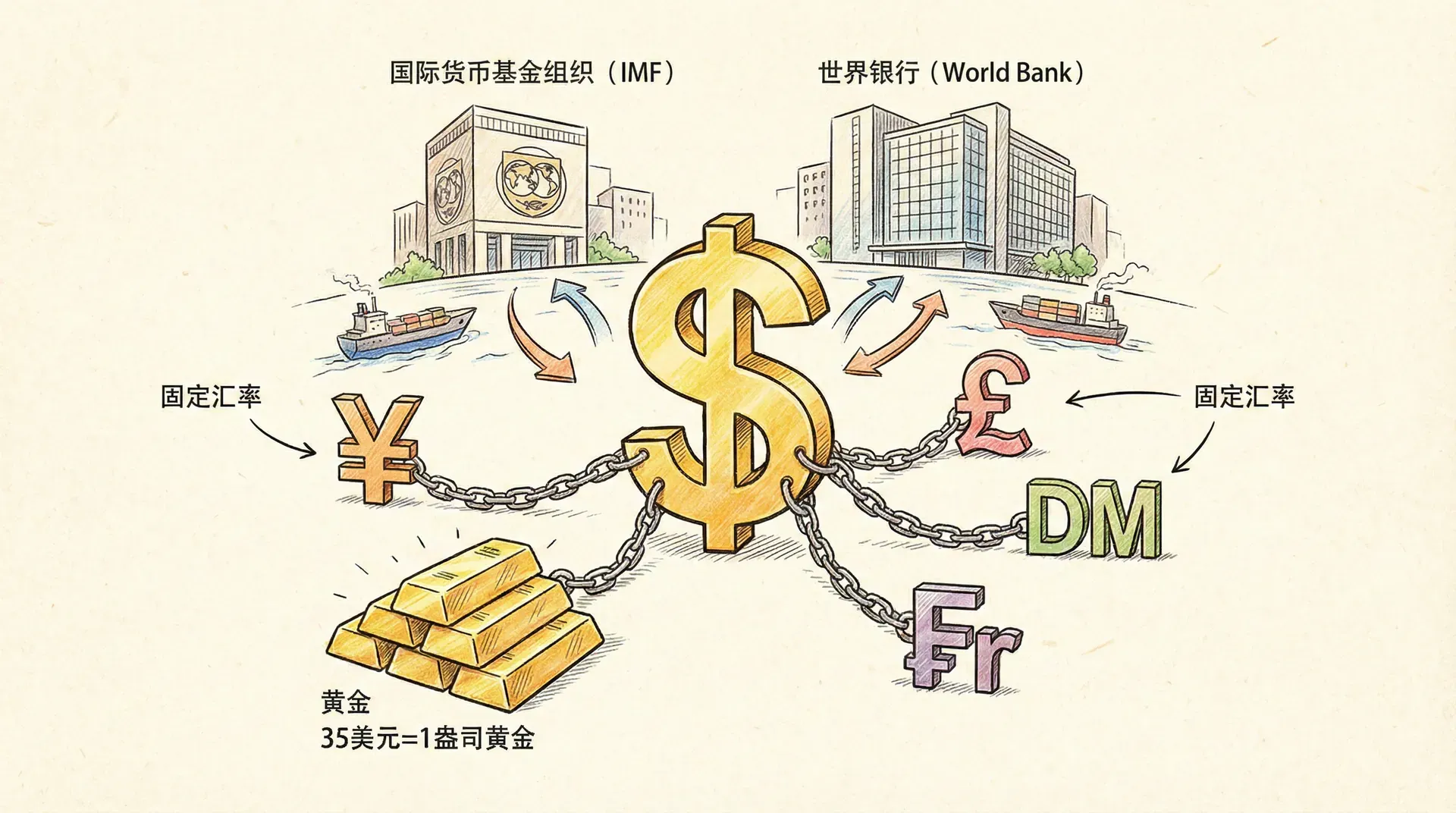 1944年,44国代表齐聚美国布雷顿森林,旨在防止战间混乱重演。体系核心是“美元-黄金-其他货币”的两级挂钩,以及建立国际货币基金为各国提供支持与协调。