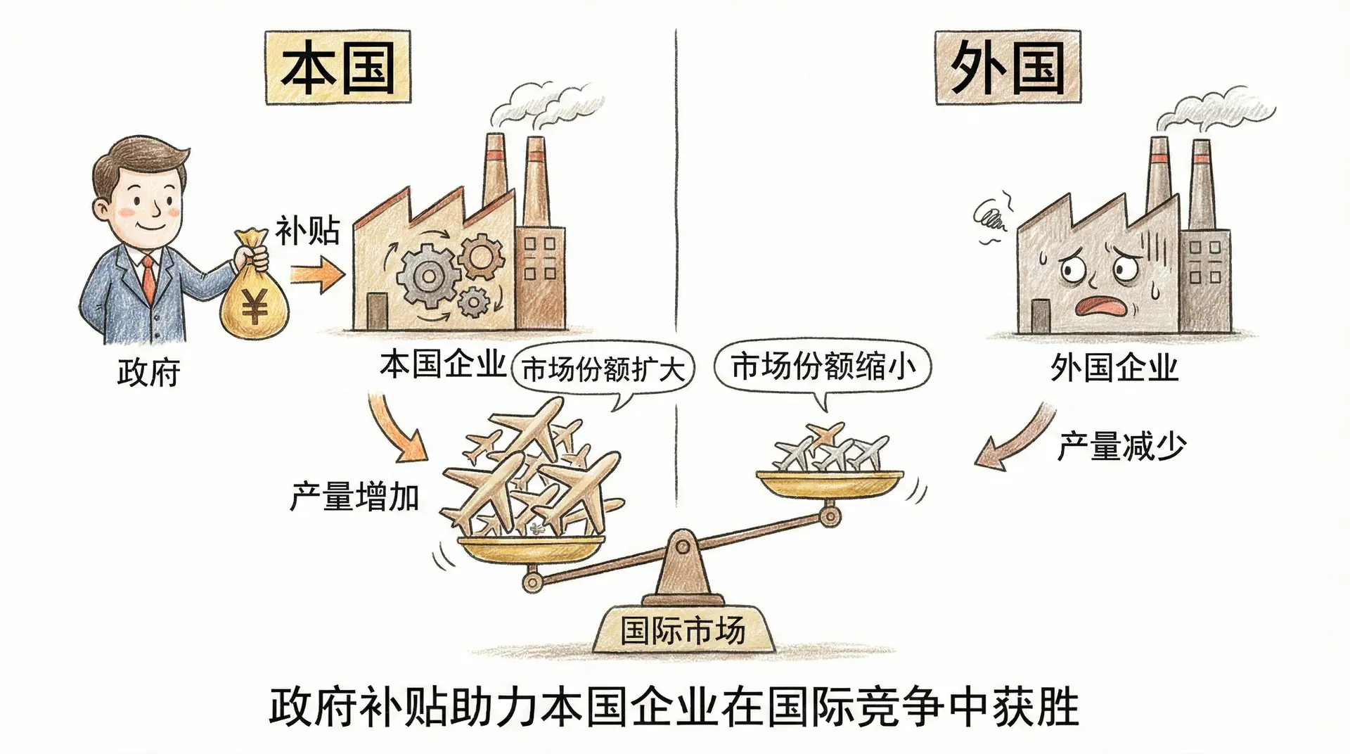 这个例子说明,政府补贴不仅直接增加了企业利润,更重要的是通过威慑作用阻止了外国竞争对手的进入,从而获得了超出补贴金额的收益。