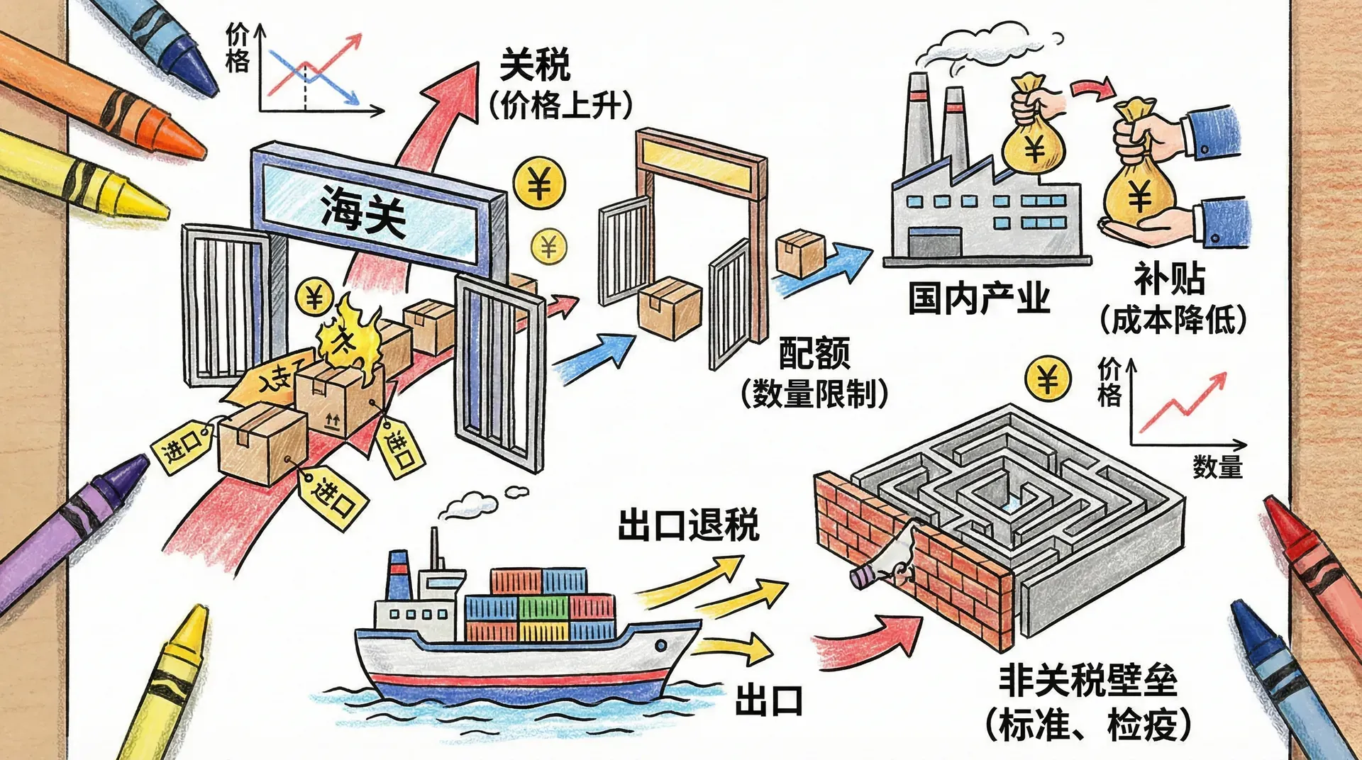 贸易政策工具是指政府用以影响进出口活动、调整国内外市场关系、实现经济和产业目标的一系列政策手段。常见的贸易政策工具主要包括关税、出口补贴、进口配额、自愿出口限制、本地含量要求、出口信贷补贴、国家采购政策和技术性贸易壁垒等。不同的工具有着不同的作用机制:有的直接影响进口商品或本地企业的成本结构,有的通过数量或资格限制来控制市场供给,有的则通过非关税措施实现政策目标。