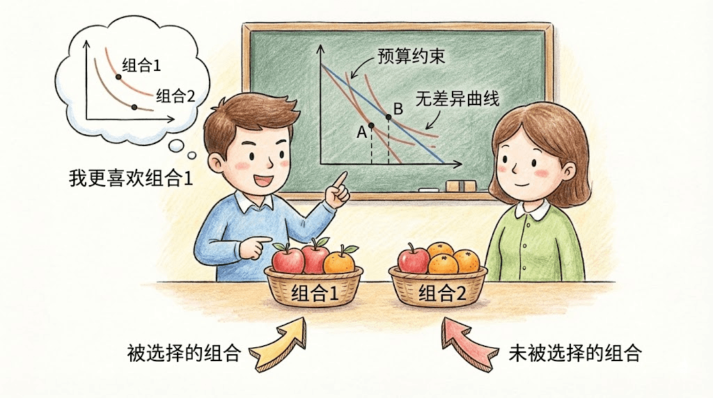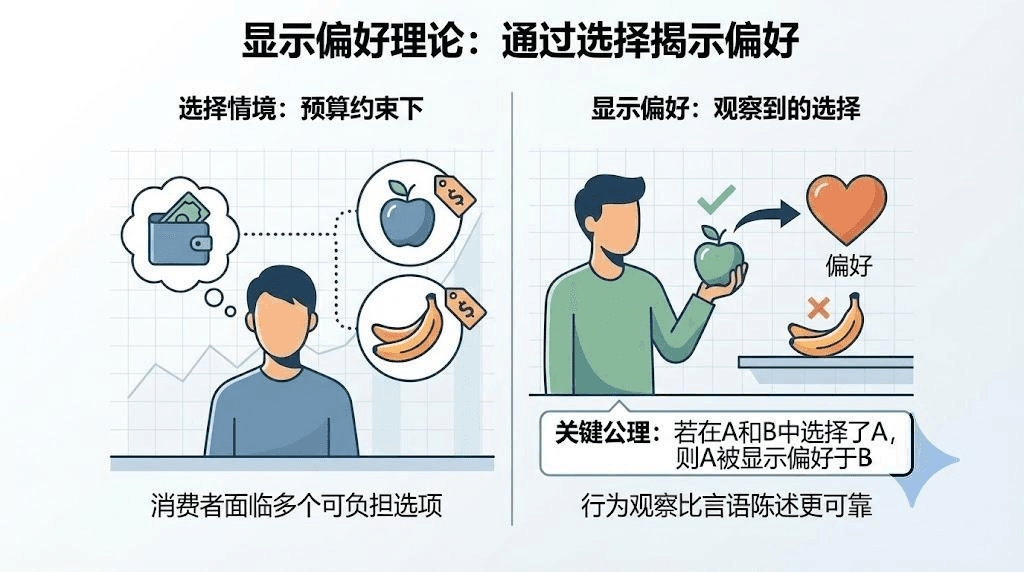 事实上,在日常生活和经济学研究中,我们几乎从未能直接看到一个人的“内部偏好”是什么。例如,我们不会直接知道一个消费者究竟喜欢苹果还是香蕉,或是他对衣服和食品的权衡到底是什么。我们能获取的信息,往往只是他在特定情况下面对不同选择时所作出的决策。基于这一点,显示偏好理论的提出就是要通过系统性地观察和分析行为,推断出背后隐藏的偏好顺序。