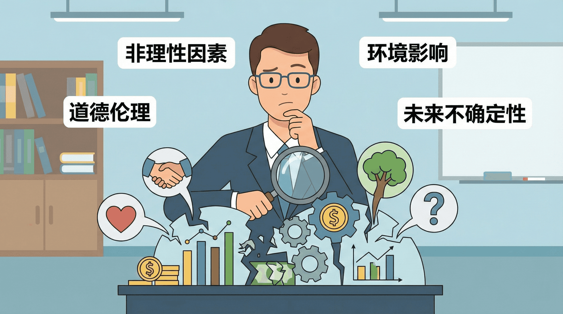 现实中的人并不总是理性的,可能会受到情绪、偏见等因素影响。以投资行为为例,传统经济学假设投资者是理性的,会根据风险和收益做出最优决策。但实际上,投资者经常受到恐惧、贪婪等情绪影响,做出非理性决策。