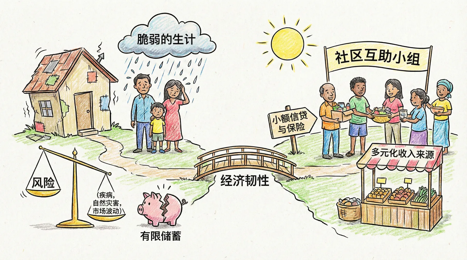 以四川某山区农户为例,家庭一方面要为突发疾病保留几千元应急金(流动性储蓄),另一方面不敢将全部劳力投入“高风险”新项目,只能“什么都做一点”,导致整体收入天花板受限。