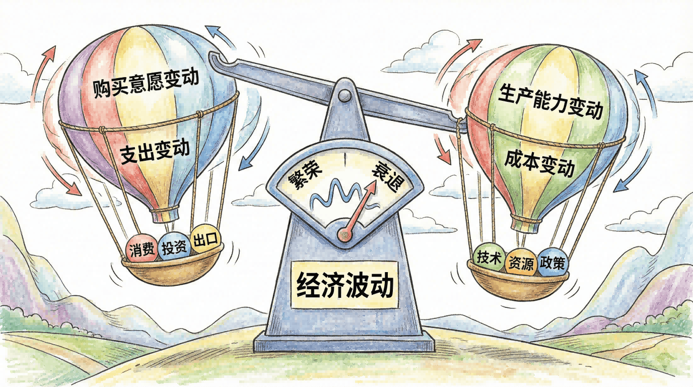 掌握了总需求和总供给模型后,我们现在可以分析经济波动的根本原因。经济波动主要来自两个源头:总需求变动和总供给变动。每种变动都有其独特的影响路径和政策含义。