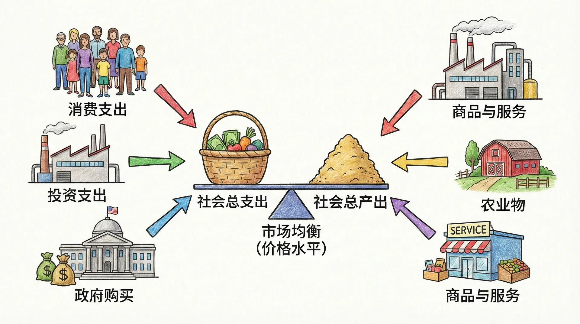 如果把整个国家的经济比作一个巨大的市场,那么这个市场里有两个最重要的主角:一个是所有想要购买商品和服务的买家(代表总需求),另一个是所有能够生产商品和服务的卖家(代表总供给)。总需求反映的是全社会在各种价格水平下愿意和能够购买的商品与服务的总量,而总供给则表示所有企业在不同价格水平下愿意和能够生产的商品与服务的总量。