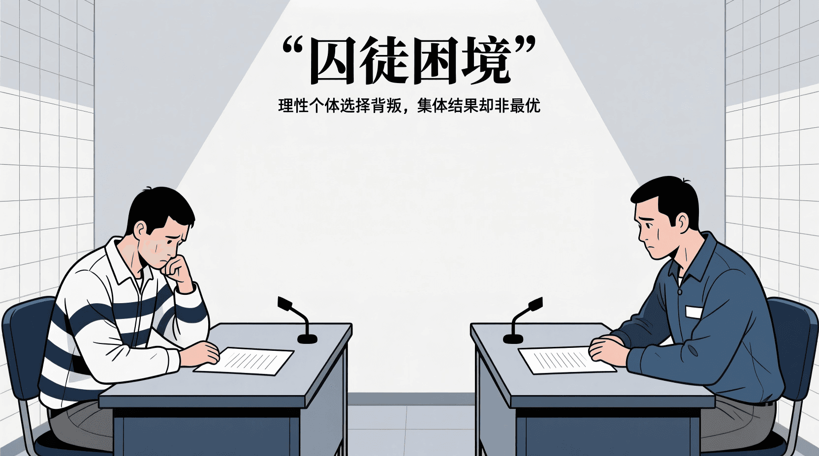一旦他们被分别审问,自利的逻辑就会占据主导地位并导致他们承认。两个囚徒之间的合作难以维持,因为合作在个体上是非理性的。