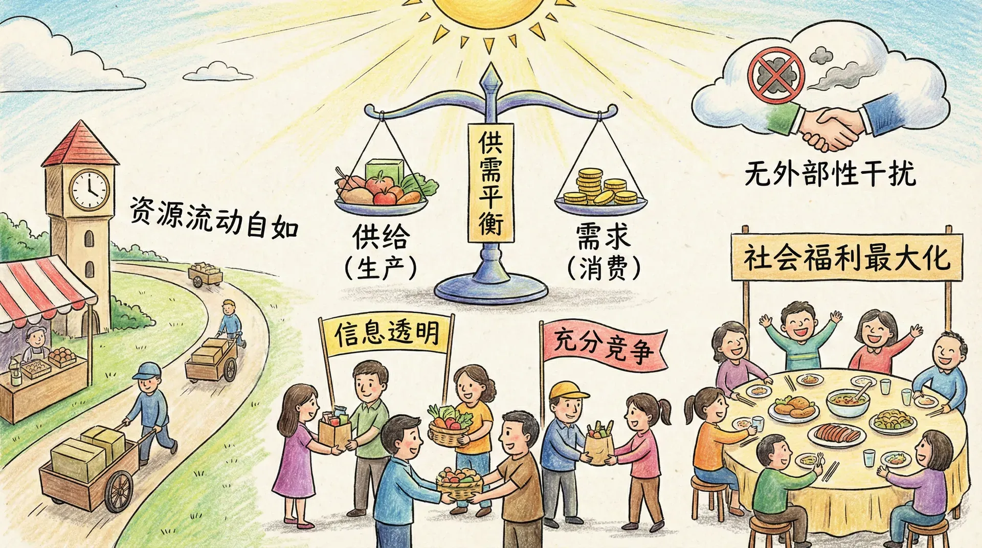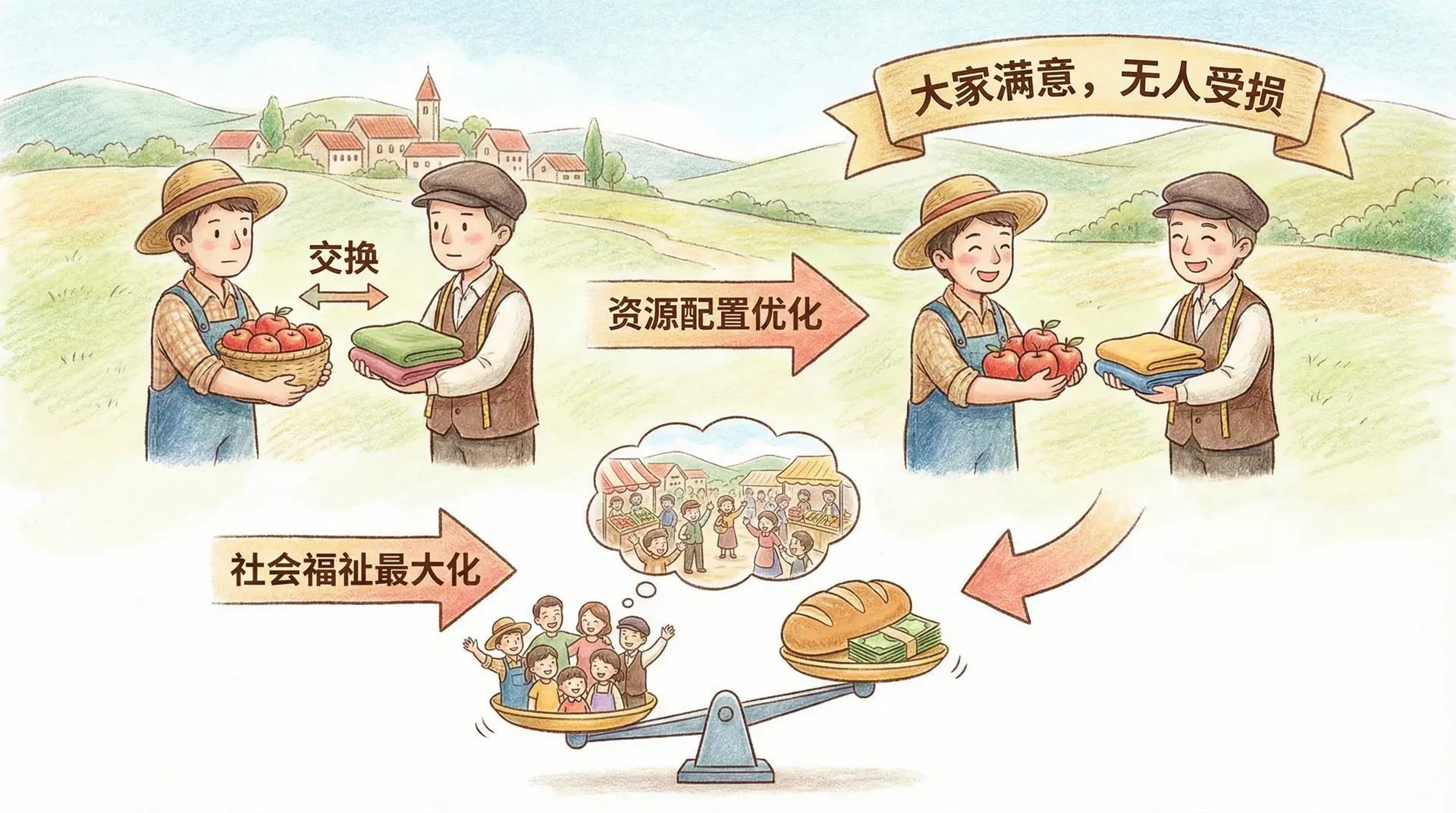 意思是说,自由市场内买卖双方自发交易所形成的资源分配,达到了任何人境况要改善则必然涉及他人受损的最优状态。现实中,农产品、快消品等市场的价格变动与供需均衡,正体现了市场自动趋向帕累托效率。