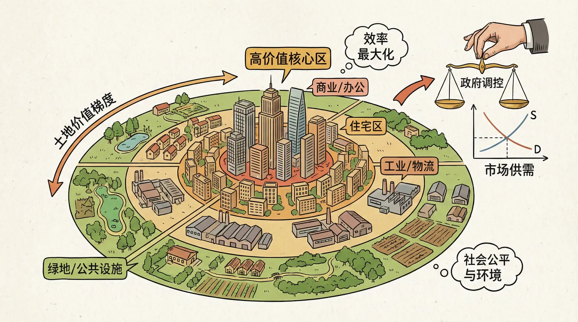 城市土地如何合理配置一直是经济学研究的重要课题。土地不仅是城市发展的基础资源,也是经济活动和社会生活的重要载体。在理想的市场环境下,土地会流向出价最高、利用效率最高的使用者,实现资源的最优配置。然而,现实中土地市场存在诸多不完善之处,例如外部性、信息不对称、公共利益需求等,这使得政府往往需要通过各种规划和调控手段来引导土地使用方向,平衡不同群体的利益诉求。