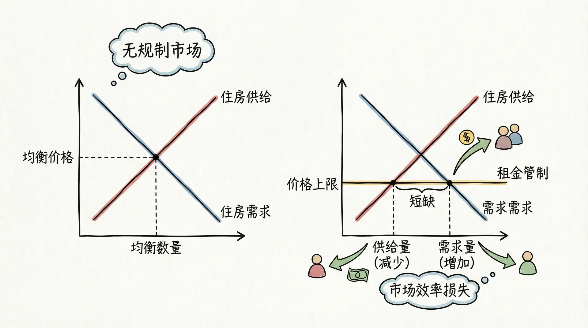 在以下的示意图中,不同规制强度下的住房供应曲线与市场均衡点清晰体现了这一现象: