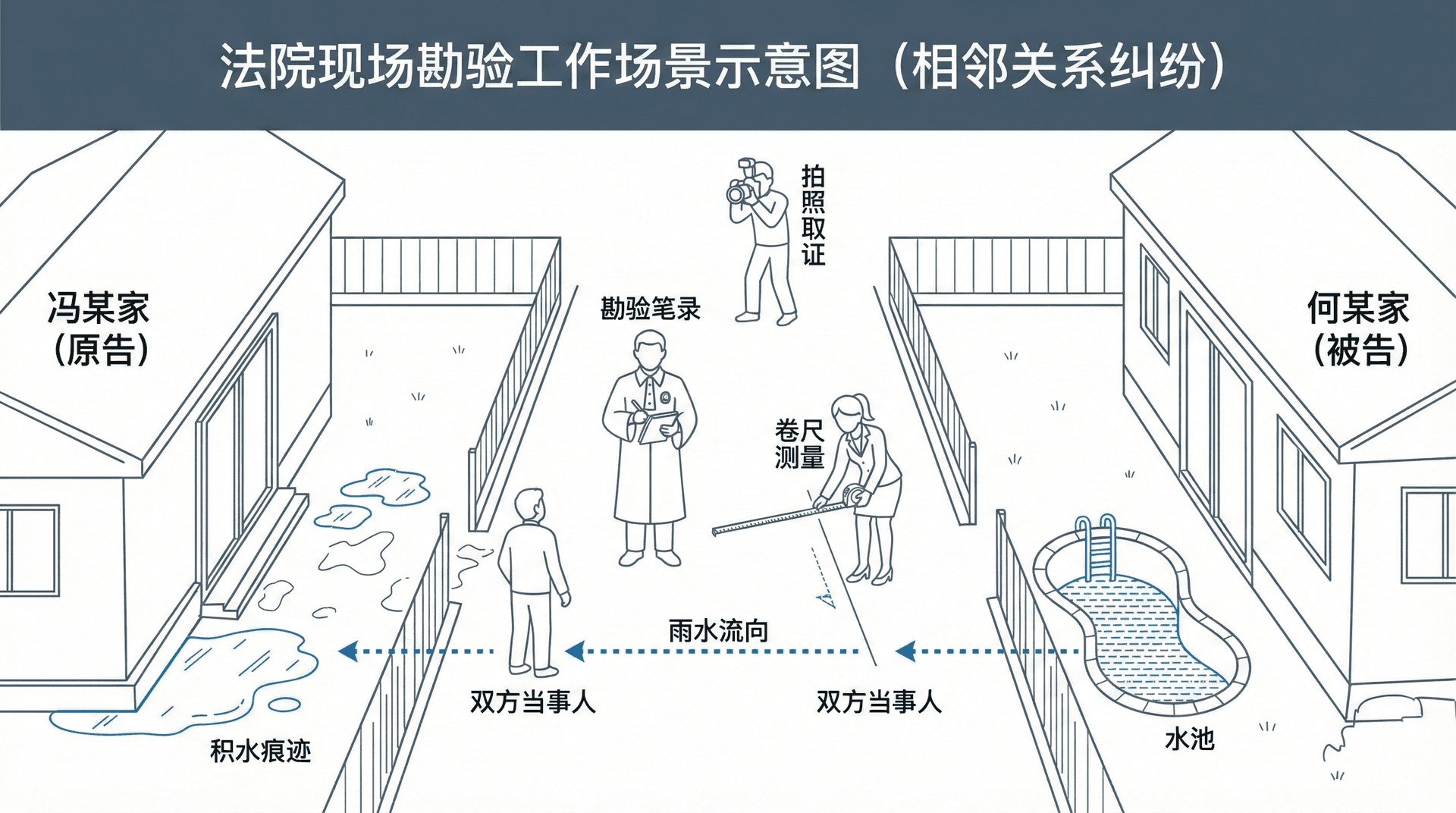 相邻关系纠纷案件中,勘验笔录经常发挥重要作用。冯某诉何某排水纠纷案,冯某主张何某在自家院内修建水池,导致雨水排放时流入冯某家中,造成财产损失。何某则认为水池的位置和排水方向都没有问题,不会影响邻居。对于水池的位置、排水走向以及是否会流入冯某家中,这些事实通过照片或者当事人的陈述很难说清楚。法院组织法官、书记员以及双方当事人到现场进行勘验,实地查看了水池的位置、地面的坡度、排水的走向,并制作了详细的勘验笔录。根据勘验笔录记载的情况,结合现场拍摄的照片和测量数据,法院认定何某修建的水池确实会导致雨水流入冯某家中,判决何某进行整改。