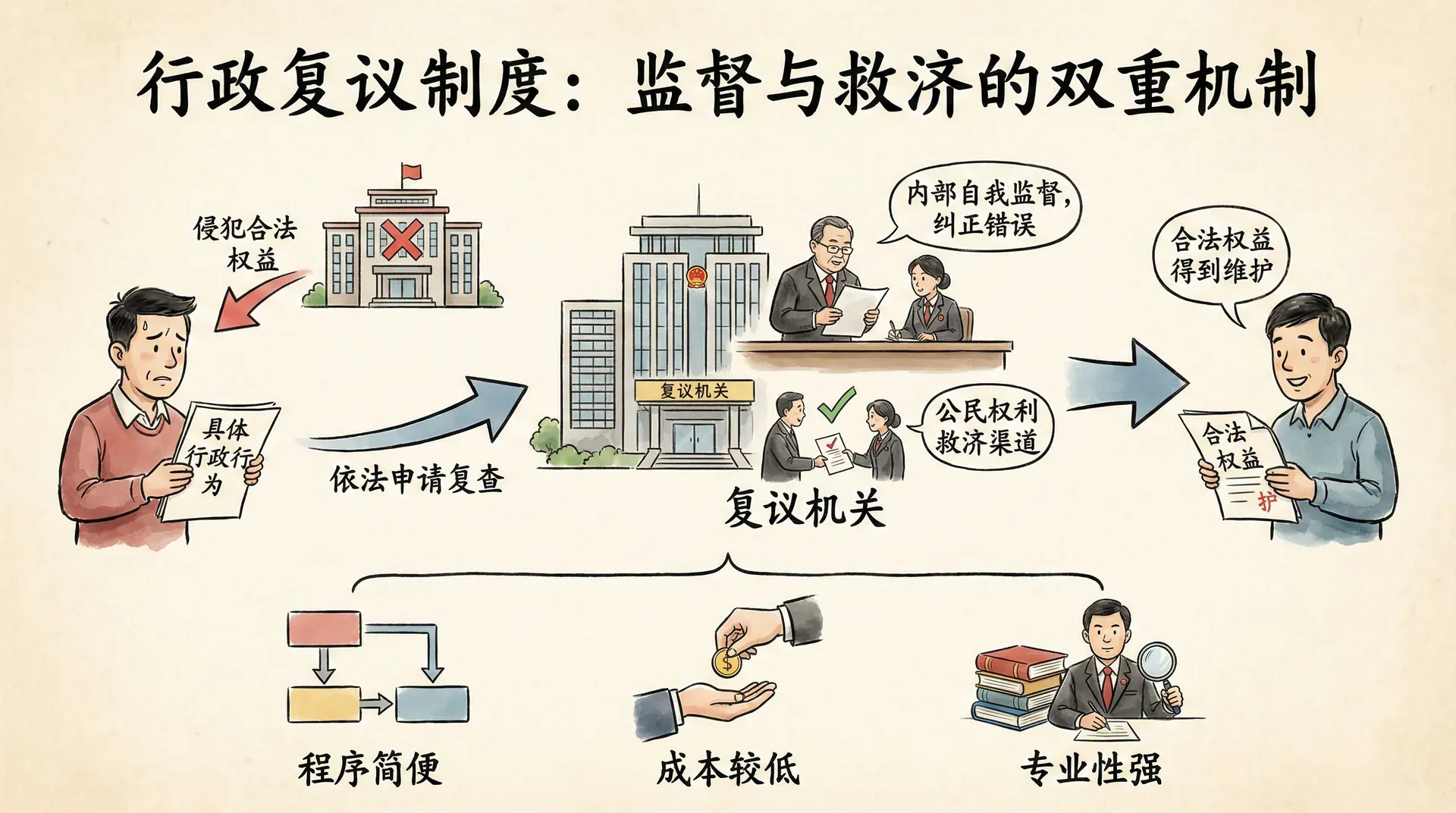 行政复议的性质和作用体现在多个方面。从性质上看,行政复议是行政机关内部对下级行政机关行政行为的监督,属于行政监督的范畴。从功能上看,行政复议既是行政机关纠正错误行政行为的机制,也是公民寻求权利救济的渠道。与行政诉讼相比,行政复议具有程序简便、成本较低、专业性强等优点。