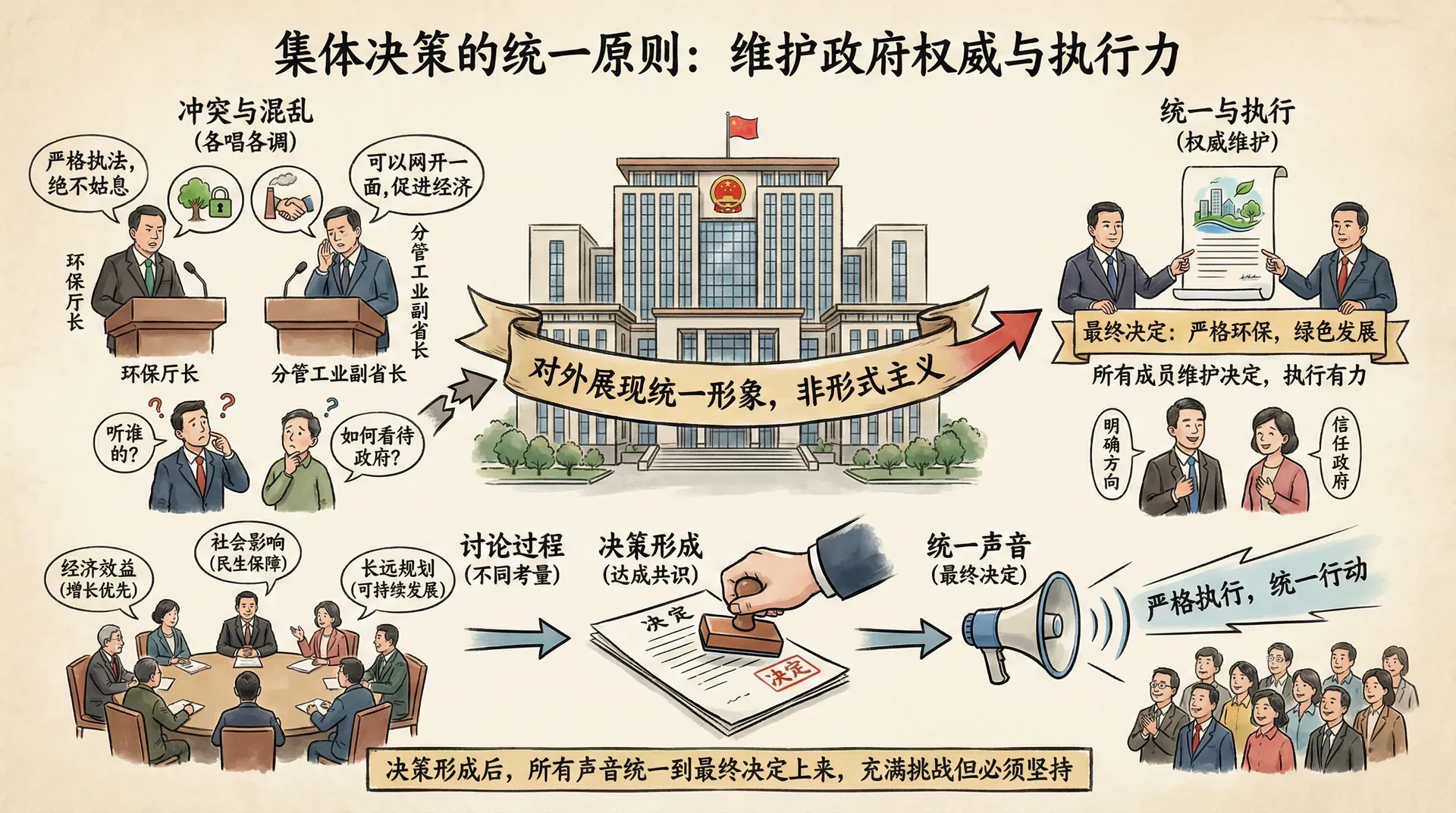 政府作为一个整体,必须对外展现统一的形象。这不是简单的形式主义,而是维护政府权威和执行力的必然要求。如果一个省政府在环保政策上各唱各调,环保厅长说要严格执法,分管工业的副省长却暗示可以网开一面,那企业该听谁的?老百姓又该如何看待这个政府?