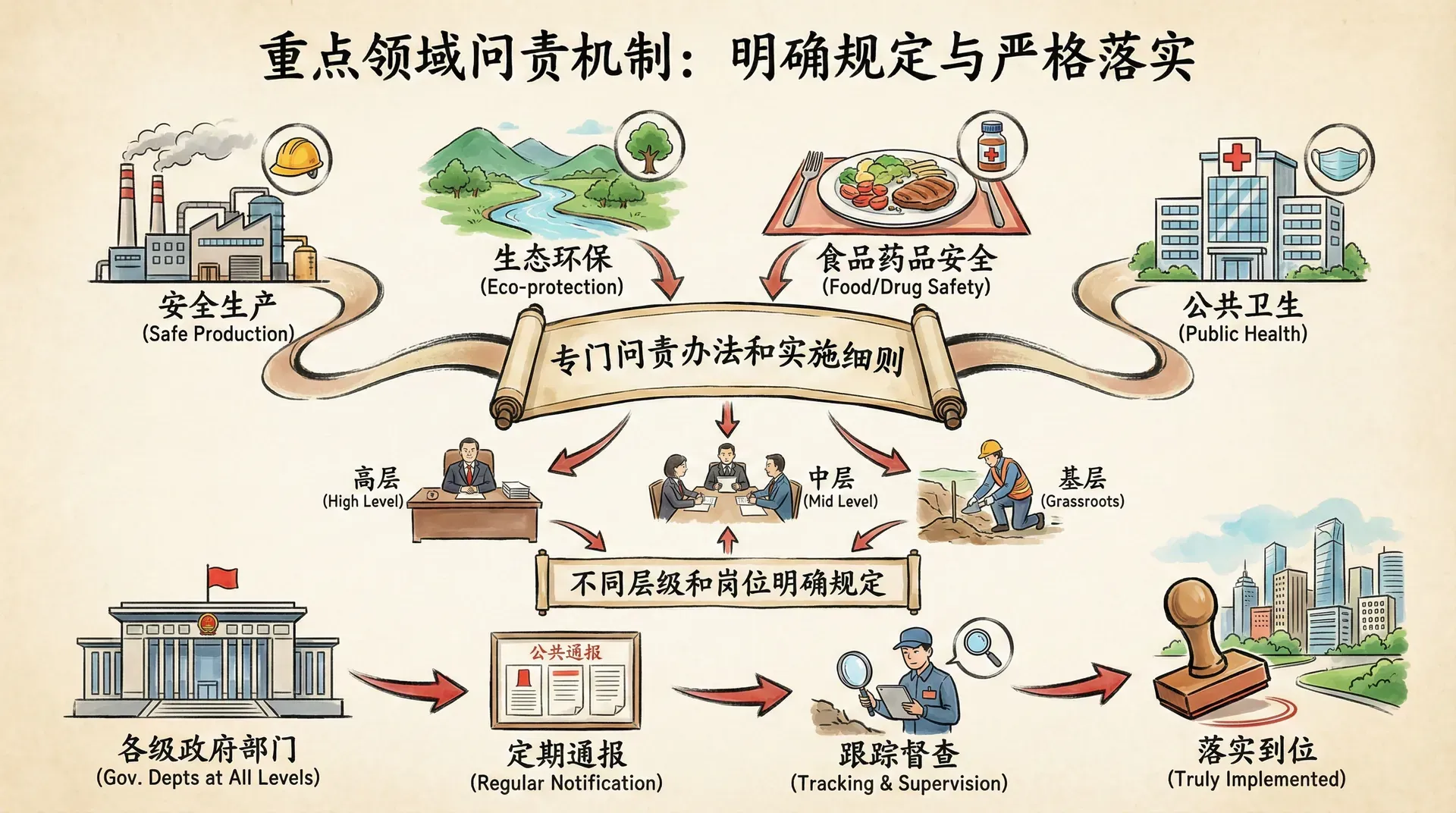 针对安全生产、生态环保、食品药品安全、公共卫生等重点领域,出台了专门的问责办法和实施细则,对不同层级和岗位的失职行为都做出了明确规定。各级政府部门也建立了定期通报和跟踪督查机制,确保问责真正落实到位。
