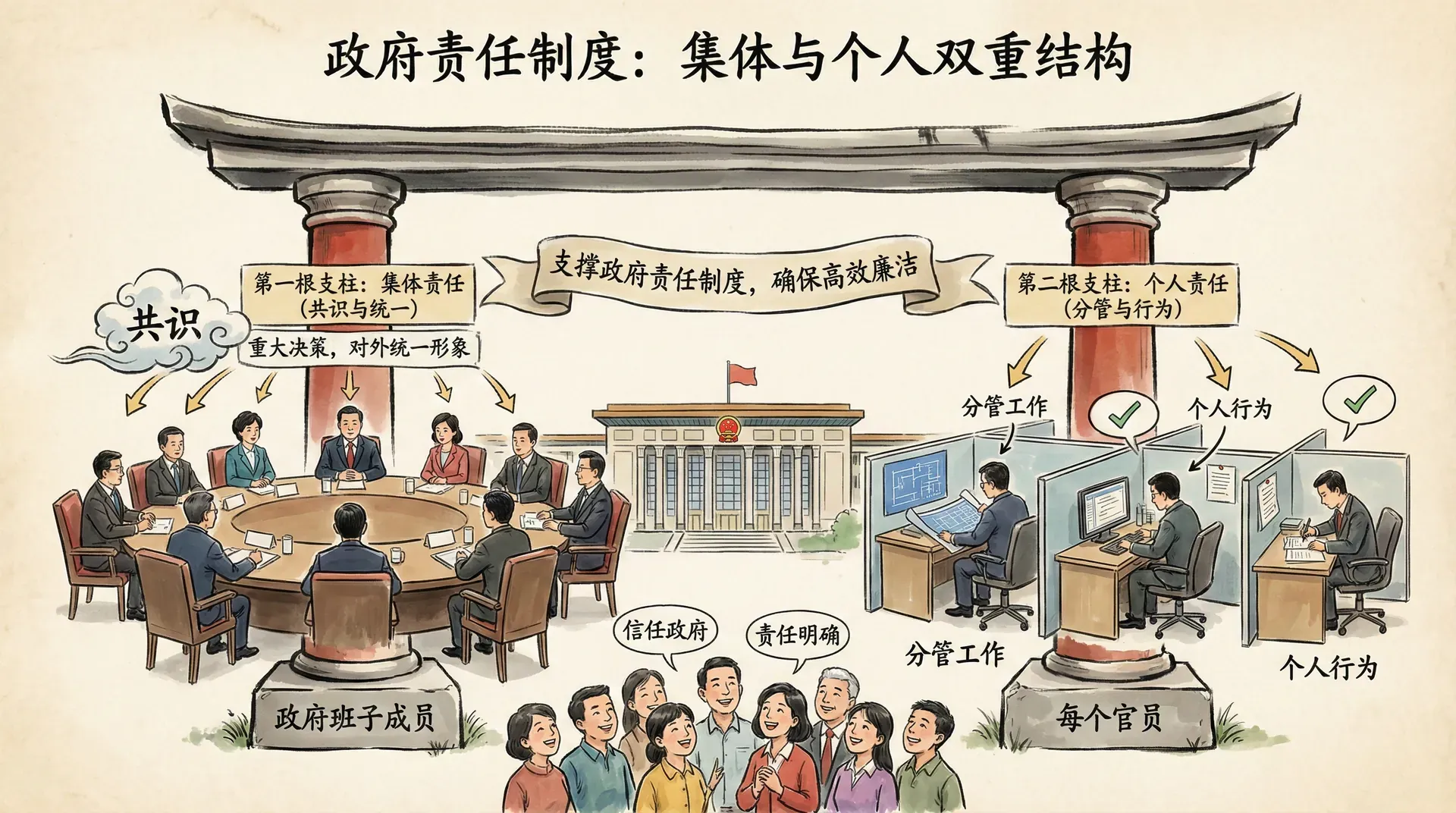 政府责任制度需要两根支柱来支撑。第一根支柱是集体责任,它要求政府班子成员对重大决策形成共识,对外展现统一的形象。第二根支柱是个人责任,它明确每个官员要为自己分管的工作和个人行为负责。
