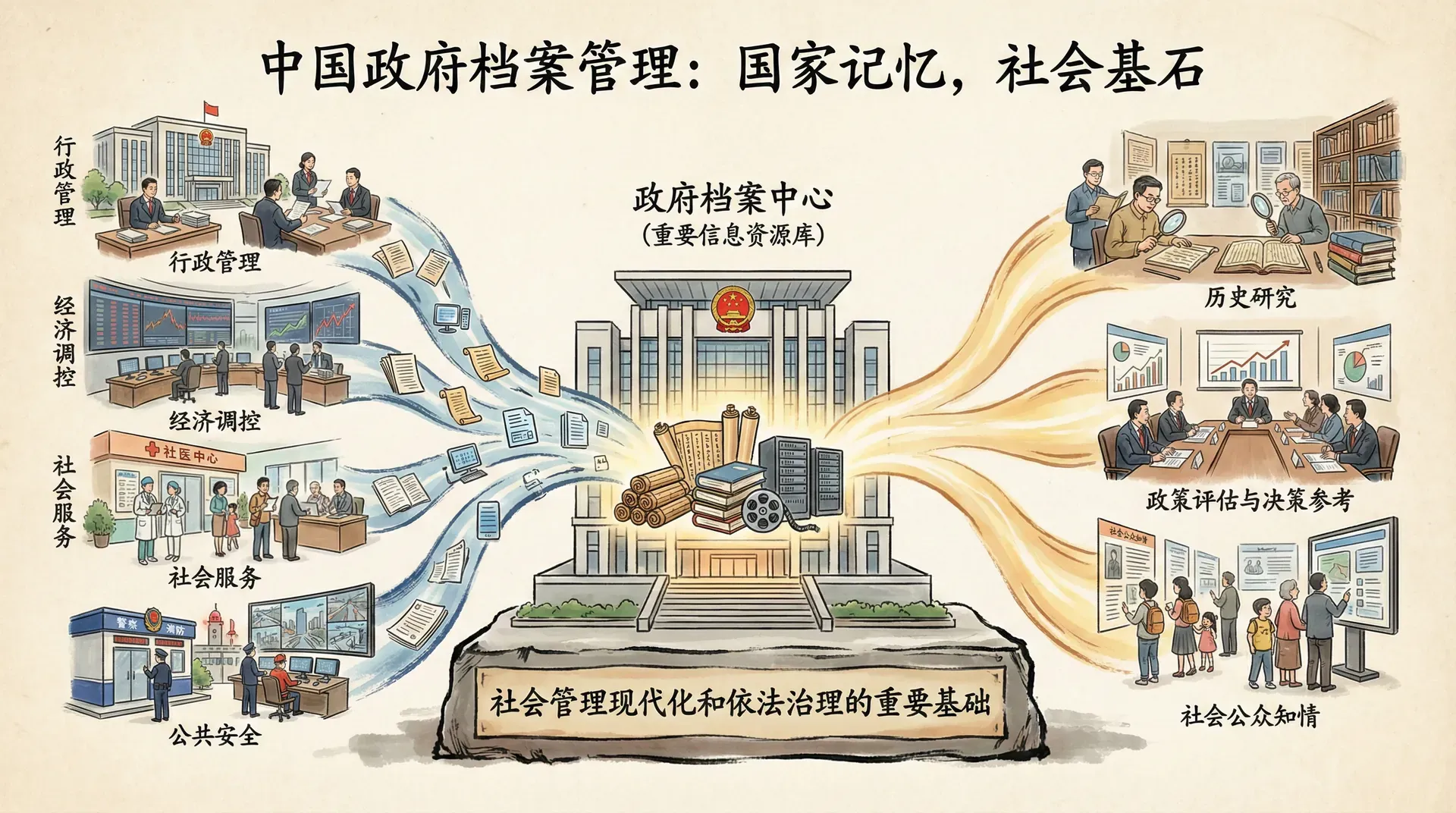 政府档案不仅是国家和社会历史事件的真实记录,更是传承社会记忆、维护国家权益和服务社会公众的重要信息资源。政府在行政管理、经济调控、社会服务、公共安全等各个领域形成的各种文件、资料、影像,以及各类决策文书和活动记录,都会归入档案体系。这些档案为历史研究、政策评估、决策参考和社会公众知情提供了坚实的支撑,是社会管理现代化和依法治理的重要基础。