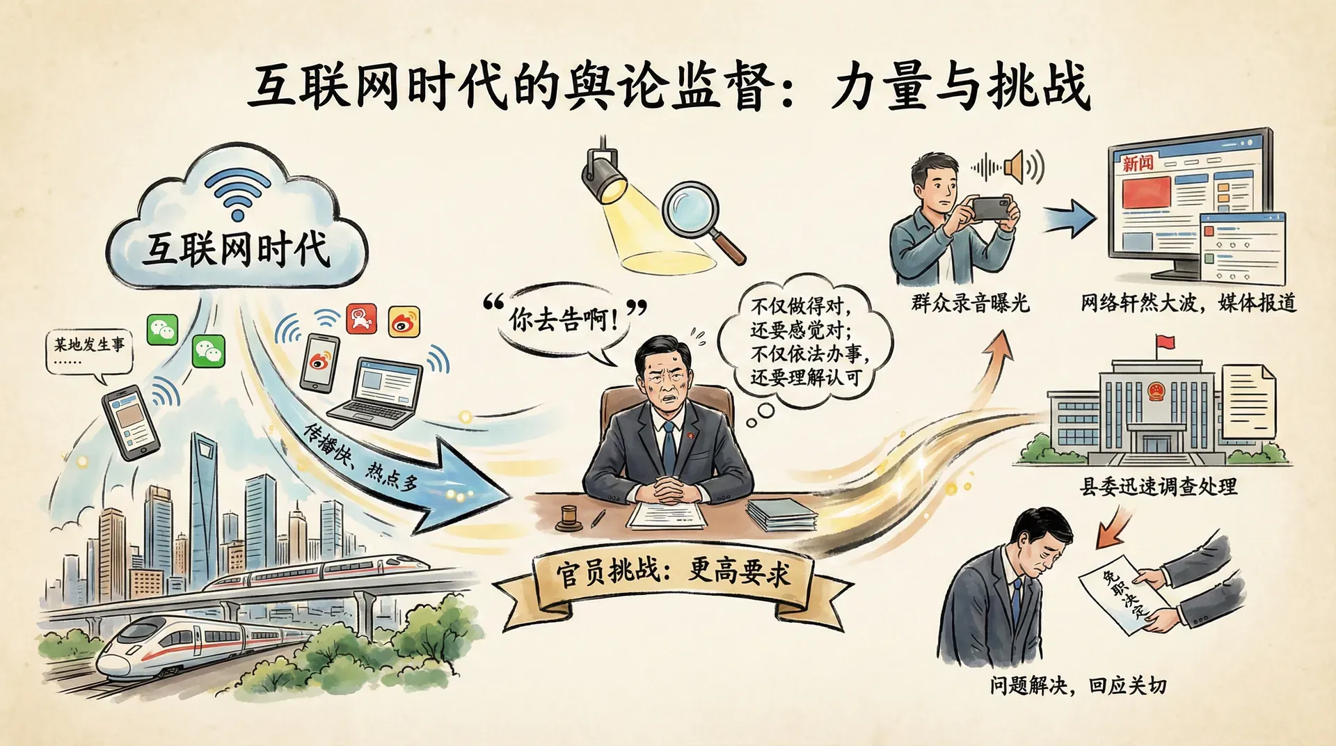 在互联网时代,舆论监督的作用越来越大。一个地方发生什么事,很快就会在网上传播。领导干部的不当言行,可能马上就会成为热点话题。这对官员提出了更高的要求:不仅要做得对,还要让老百姓感觉对;不仅要依法办事,还要让群众理解认可。