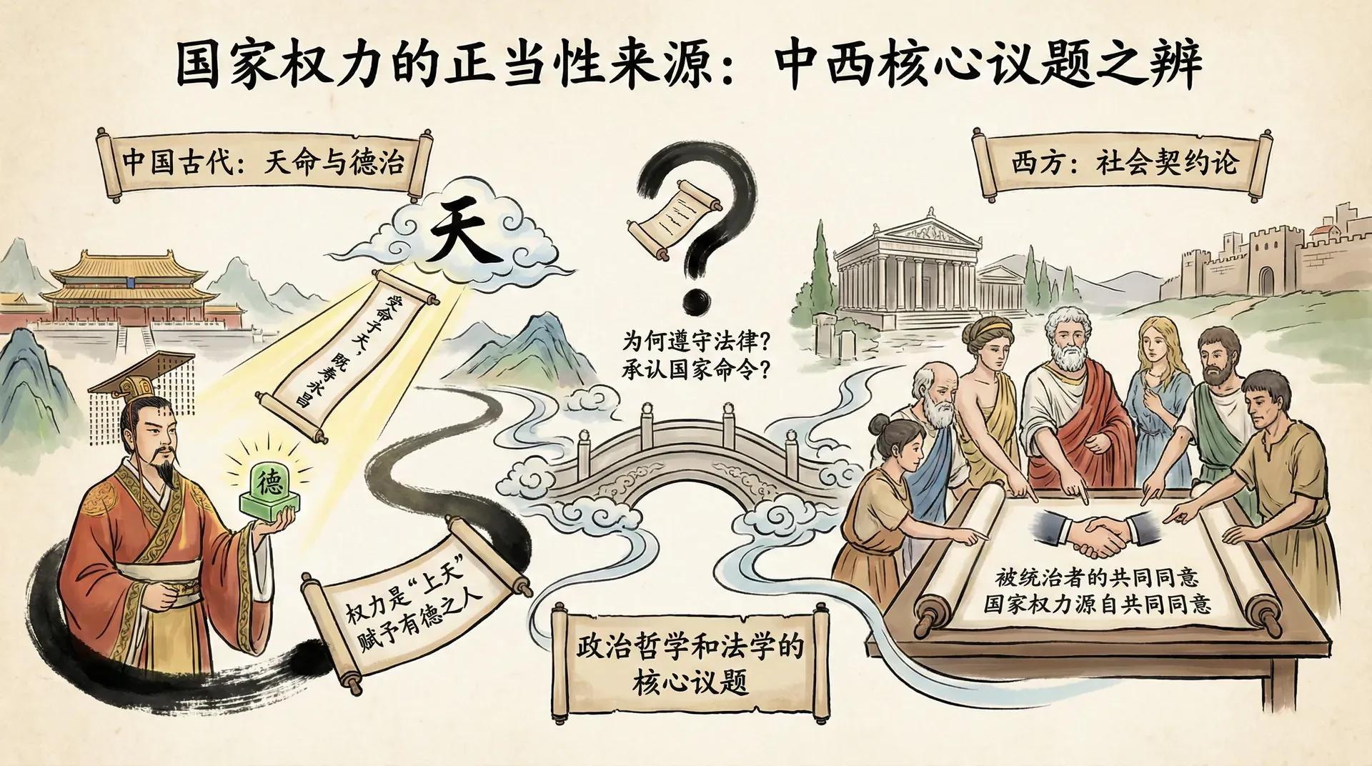 国家权力的来源是什么?为何社会成员会自愿遵守法律并承认国家的命令具有约束力?这个问题在不同历史时期、不同文化传统中始终是政治哲学和法学的核心议题之一。