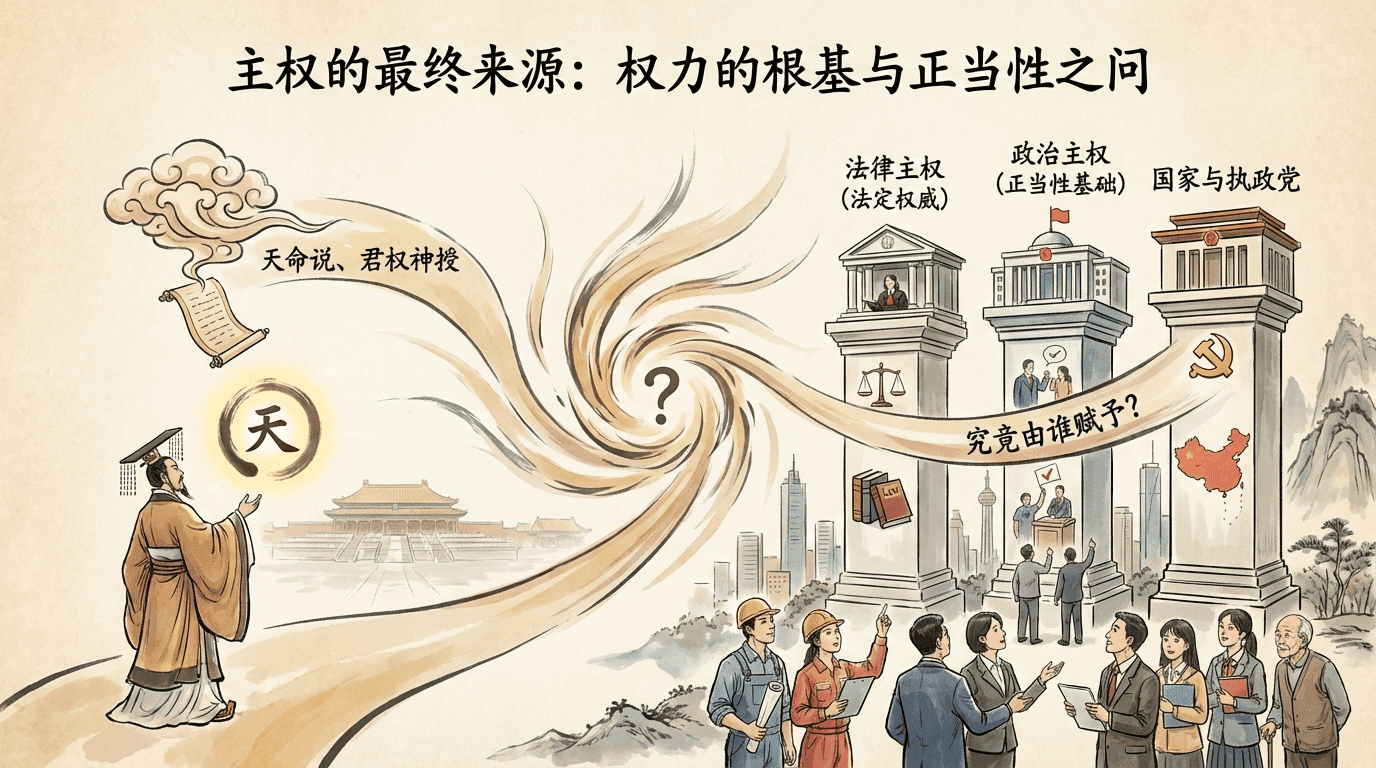 主权的最终来源是什么?是国家本身,还是政府,还是执政党?无论是法律主权,还是政治主权,这种至高无上的权力究竟由谁赋予,它的正当性基础究竟何在?传统上,有“天命说”、“君权神授说”等理论,主张主权源自神的意旨或天命安排。