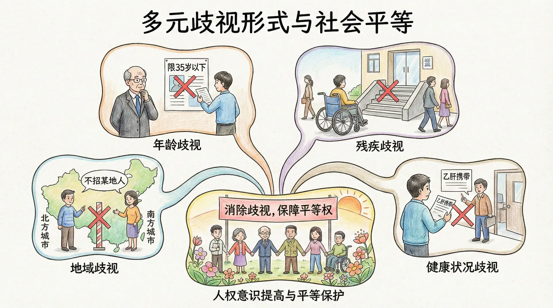除了种族、民族、性别歧视外,社会中还存在多种形式的歧视。年龄歧视、残疾歧视、地域歧视、健康状况歧视等,同样侵犯了公民的平等权。随着社会发展和人权意识提高,对这些歧视形式的关注和保护也日益加强。
