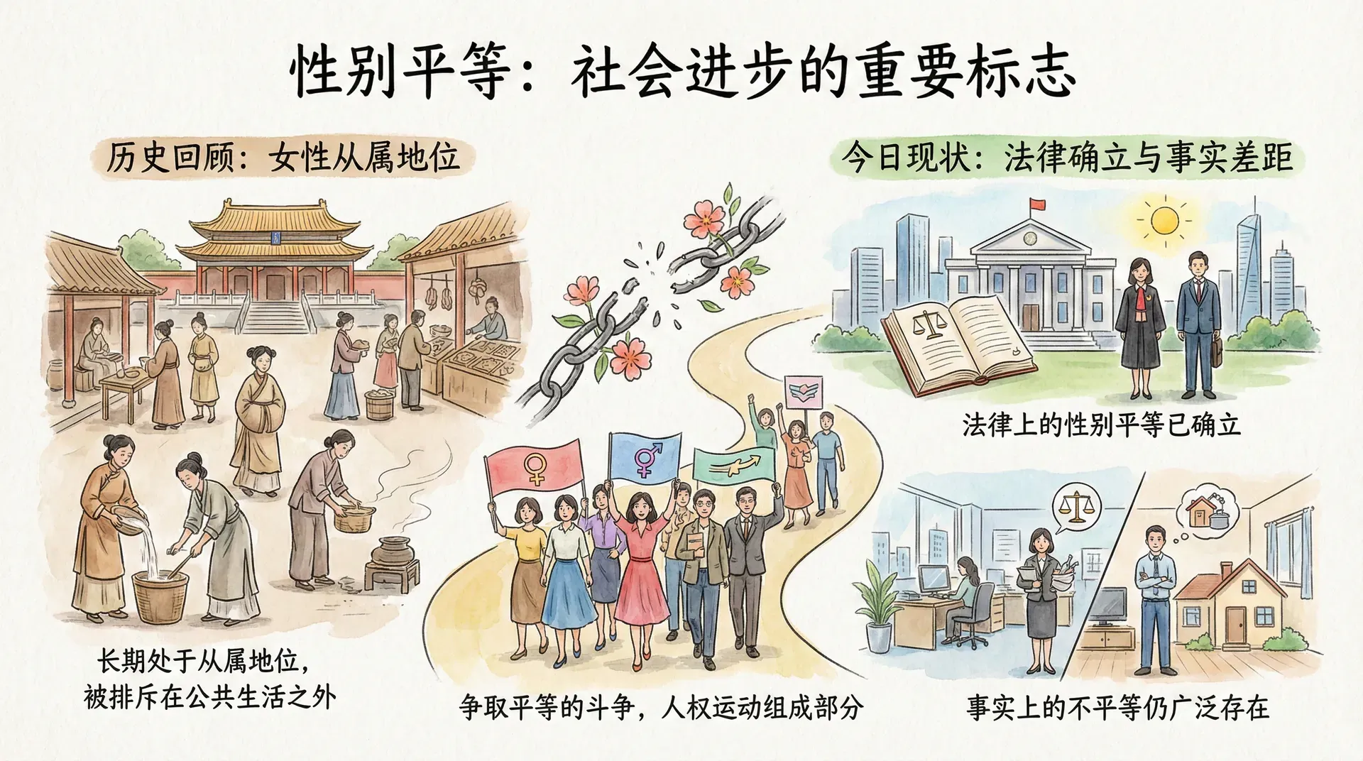 性别平等是人类社会进步的重要标志。回顾历史,女性长期处于从属地位,被排斥在政治、经济、文化生活之外。争取性别平等的斗争与争取种族平等一样,都是人权运动的重要组成部分。今天,虽然法律上的性别平等已在大多数国家确立,但事实上的不平等仍然广泛存在。