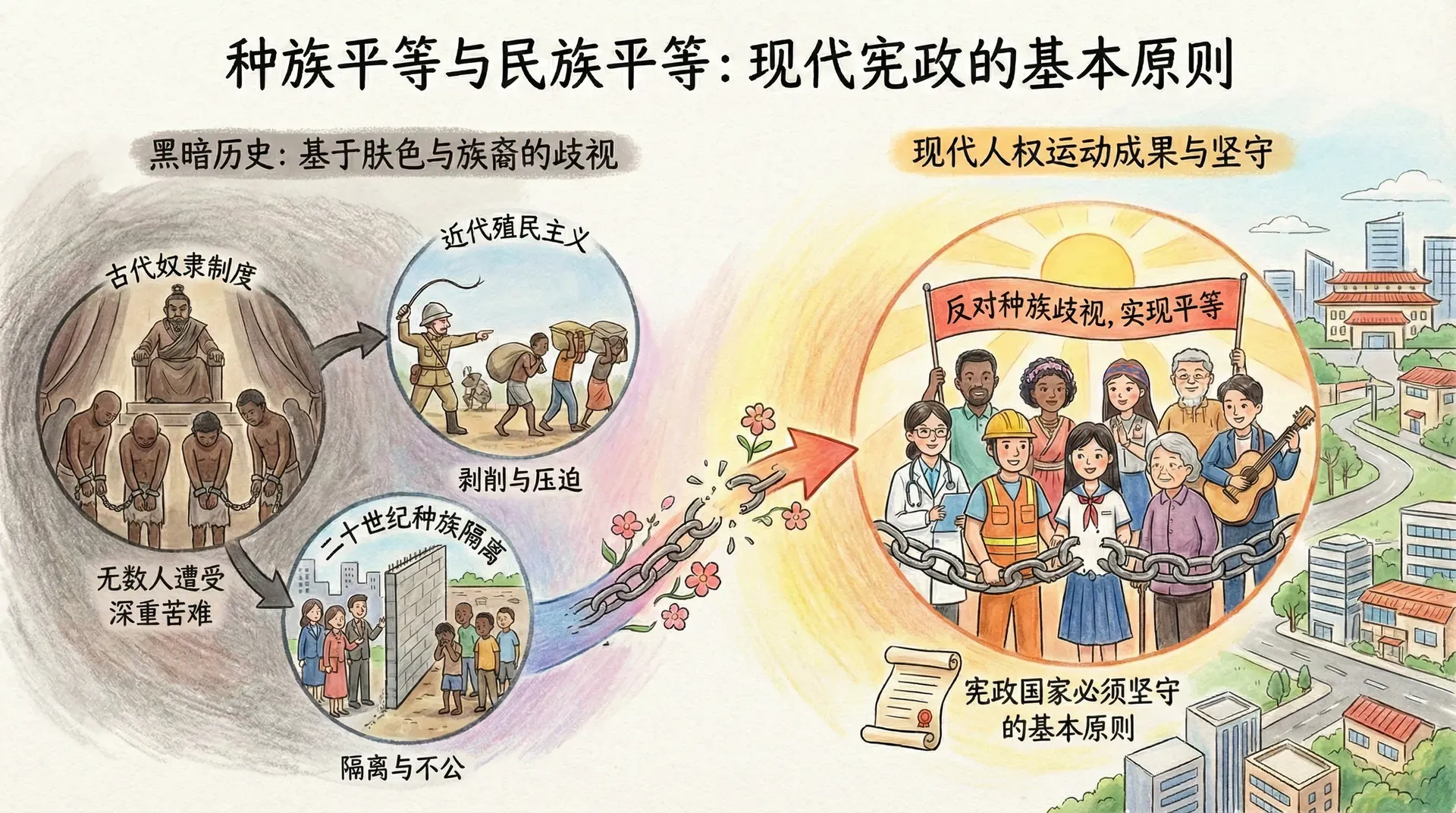 种族歧视是人类历史上最黑暗的篇章。从古代的奴隶制度到近代的殖民主义,再到二十世纪的种族隔离政策,基于肤色、族裔的歧视给无数人带来了深重苦难。反对种族歧视、实现种族平等是现代人权运动的重要成果,也是宪政国家必须坚守的基本原则。