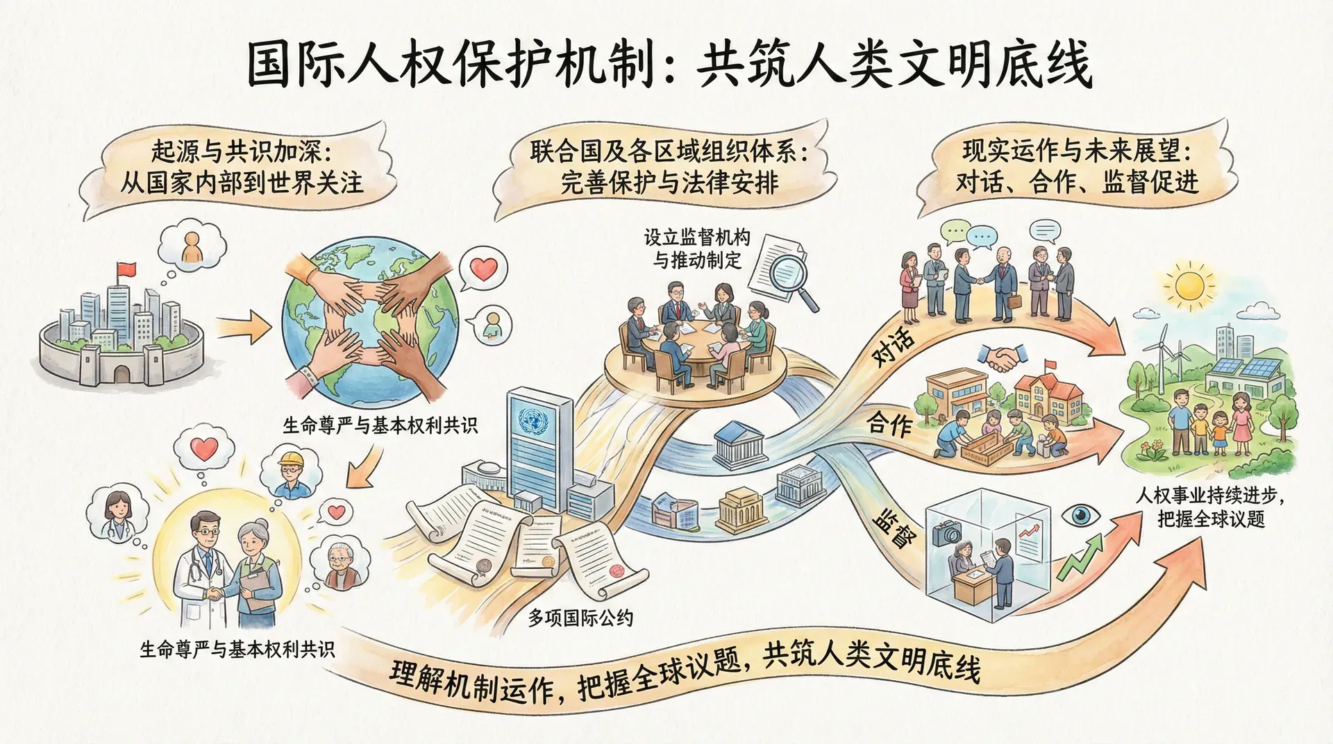 为应对不同国家、文化背景下的人权挑战,联合国及各区域组织不断完善国际人权保护体系,推动制定多项国际公约,设立监督机构,并通过对话、合作和监督促进人权事业的持续进步。理解国际人权保护机制的起源、发展和现实运作,对于把握全球人权议题和中国的相关立场具有重要意义。