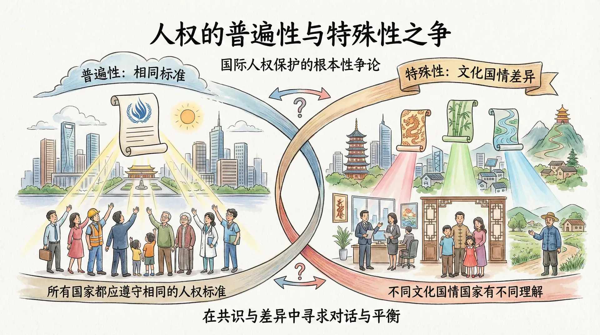 国际人权保护面临的一个根本性争论是:人权是普遍的还是相对的?所有国家都应该遵守相同的人权标准,还是不同文化、不同国情的国家可以有不同的人权理解?这个问题涉及人权的普遍性与特殊性之争。