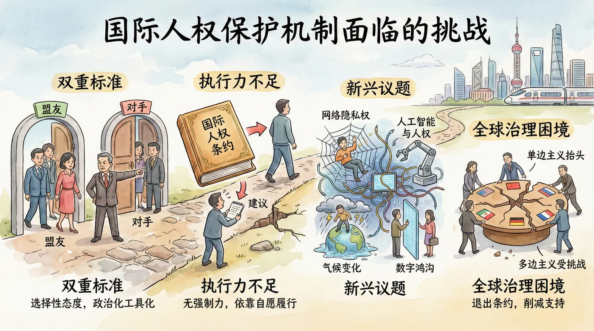 再次是新兴人权议题的挑战。随着科技发展和全球化进程,出现了许多新的人权问题:网络隐私权、人工智能与人权、气候变化与人权、数字鸿沟等。传统的人权框架如何应对这些新问题,是国际人权法面临的新课题。