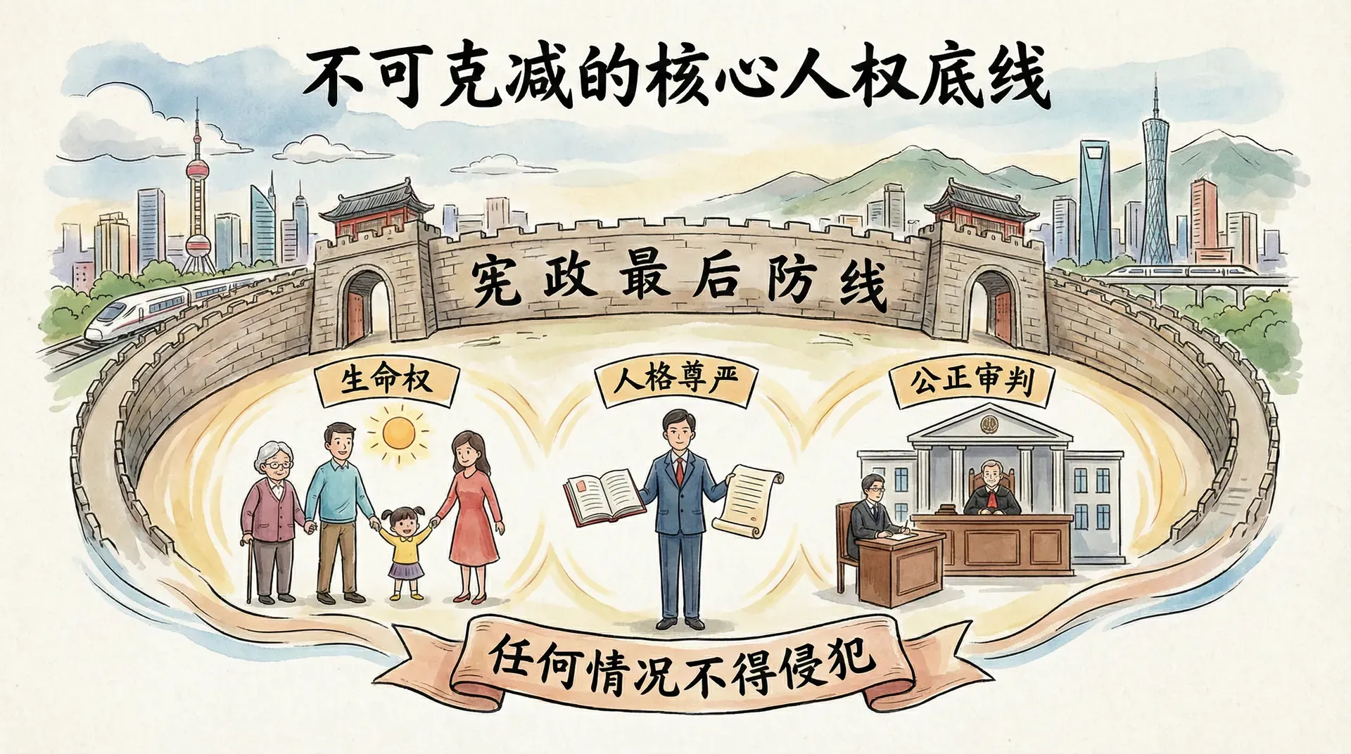 在紧急状态和国家安全的名义下,许多权利可以受到限制,但并非所有权利都可以被克减。国际人权法和各国宪法都承认,某些最基本的人权在任何情况下都不得侵犯,这构成了人类文明的底线,也是宪政的最后防线。