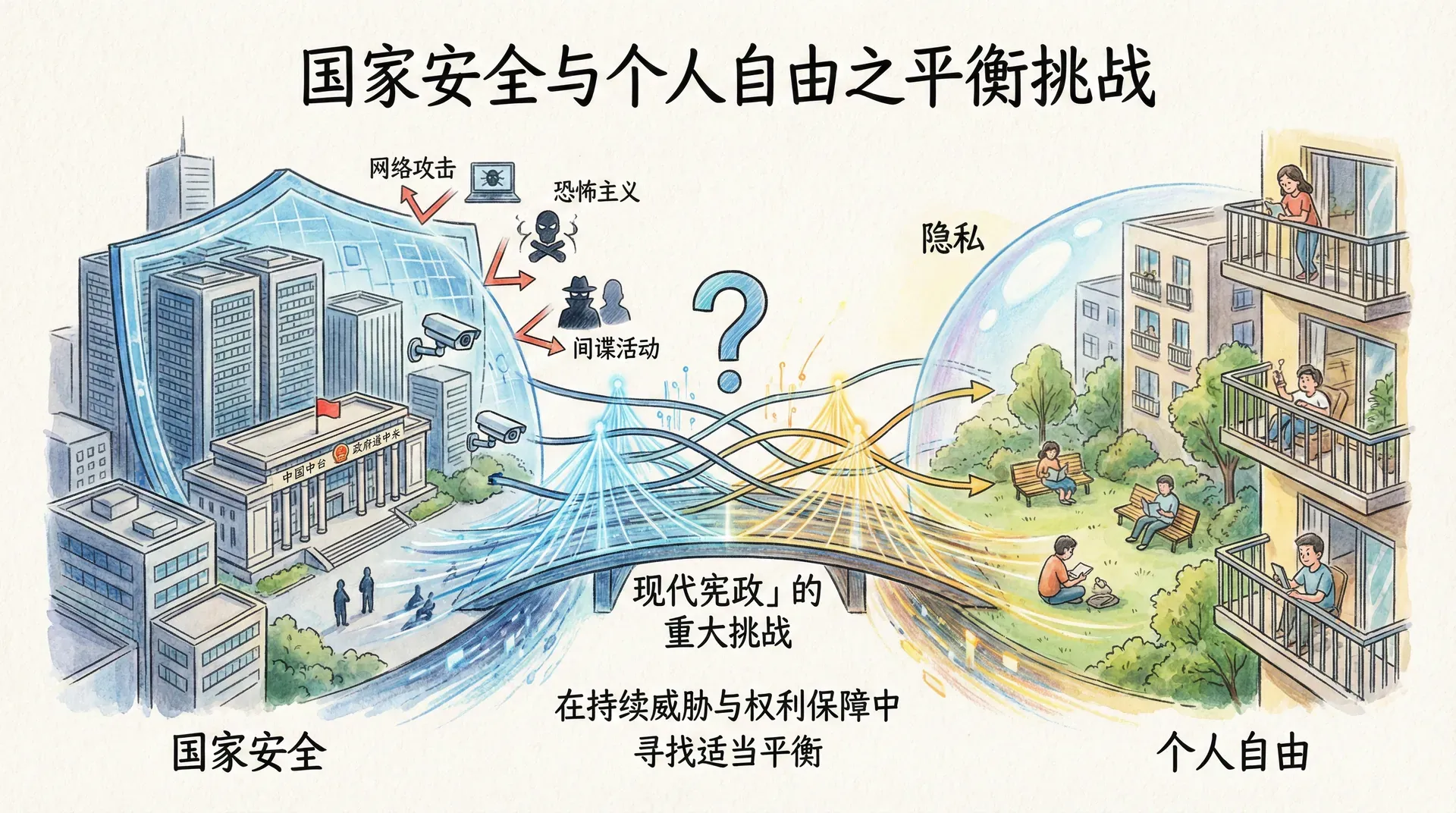 反恐怖主义、网络安全和监控措施引发了深刻的权利与安全之争。预防性限制自由的措施、无处不在的监控系统,这些现代治理手段在提供安全保障的同时,也对隐私权和自由构成了挑战。宪政的智慧在于寻求动态平衡:根据威胁的性质和程度,在法律框架内合理限制某些权利,但必须接受监督和审查,并在威胁减轻后及时恢复正常状态。