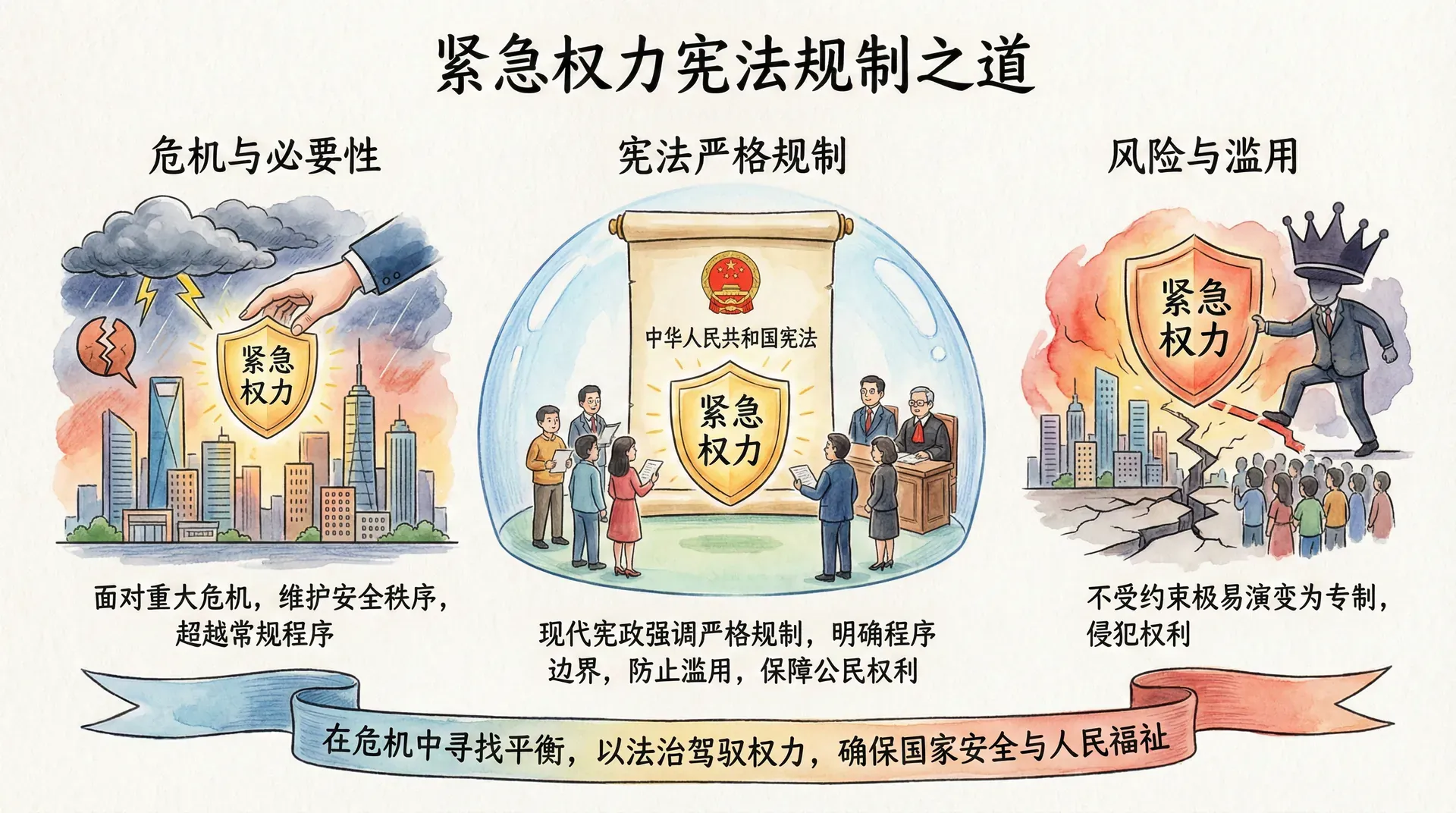 紧急状态是一种宪法上的例外状态,政府可以在法定条件下采取超常措施应对危机。但这种权力必须受到严格限制:宣布紧急状态需要遵循法定程序、紧急权力的行使必须遵守必要性和比例性原则、立法机关和司法机关应当保持持续监督。中国在应对汶川地震、非典疫情和新冠疫情等重大突发事件中积累了丰富经验,也暴露出需要进一步完善的制度问题。