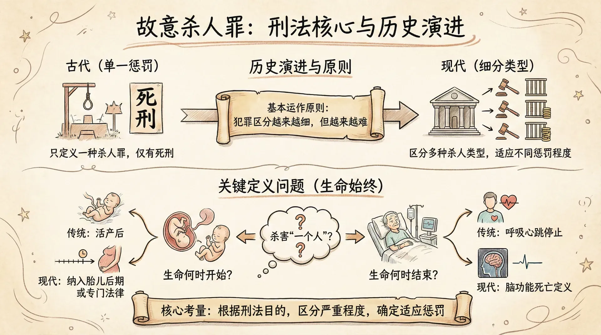 故意杀人罪是开始讨论的最佳场所,不仅因为这种犯罪的重要性,还因为杀人罪法律的发展体现了刑法史上的一个基本运作原则:犯罪之间区分越来越细,但做出这种区分也越来越困难。历史上曾只定义了一种杀人罪,只有一种惩罚——死刑。从那时起,法院和立法机关区分了许多不同类型的杀人罪,并规定了与之相适应的不同惩罚程度。在每一步,他们都必须根据刑法的目的区分更严重和不太严重的犯罪。