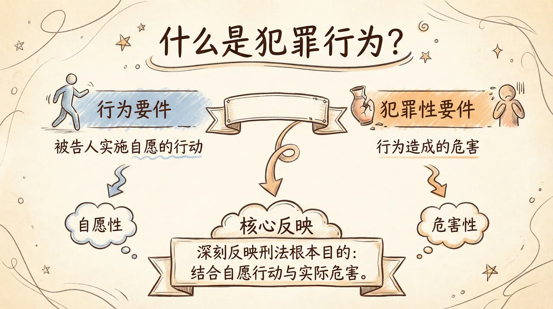 每一种犯罪都要求同时具备犯罪行为和相应的主观心理状态。犯罪行为的要求看似简单,在实践中争议也不多,但它深刻反映了刑法的根本目的。行为要件要求被告人实施了自愿的行动,犯罪性要件则涉及该行为所造成的危害。