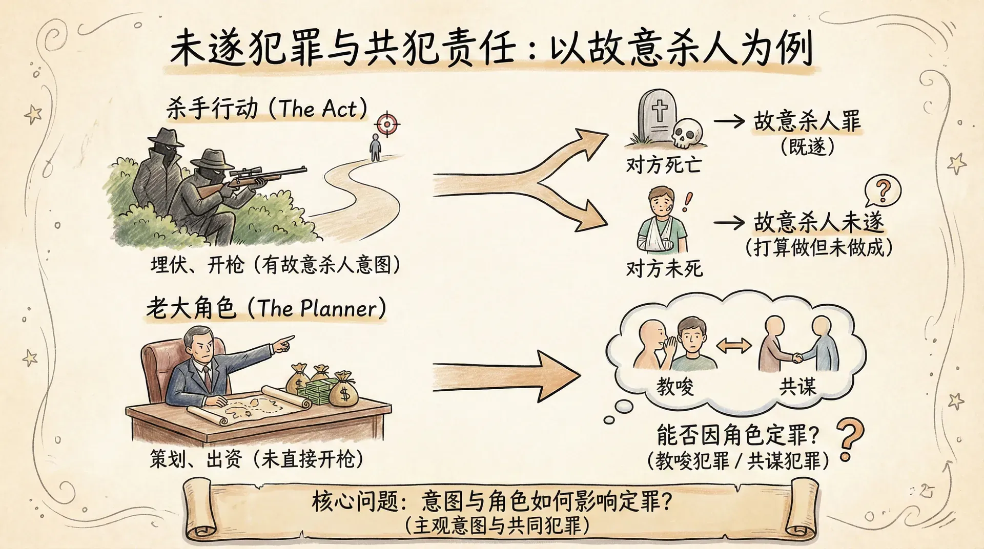 大多数情况下,一个人只有在满足犯罪定义的所有构成要件时才能被定罪。故意杀人罪要求行为人故意剥夺他人生命。某犯罪集团的老大派出两名杀手去暗杀竞争对手。杀手们埋伏在对方的必经之路上,开枪射击。如果对方死了,杀手们犯了故意杀人罪;但如果对方没有死,杀手们是否只构成故意伤害罪?还是他们可以因为他们打算做但没有做成的事——即故意杀人未遂——而被起诉?进一步说,如果对方死了,派出杀手的老大怎么办?他没有开枪,但他是这次行动的策划者和出资人。他能否因其扮演的角色——即教唆犯罪或共谋犯罪——而被定罪?