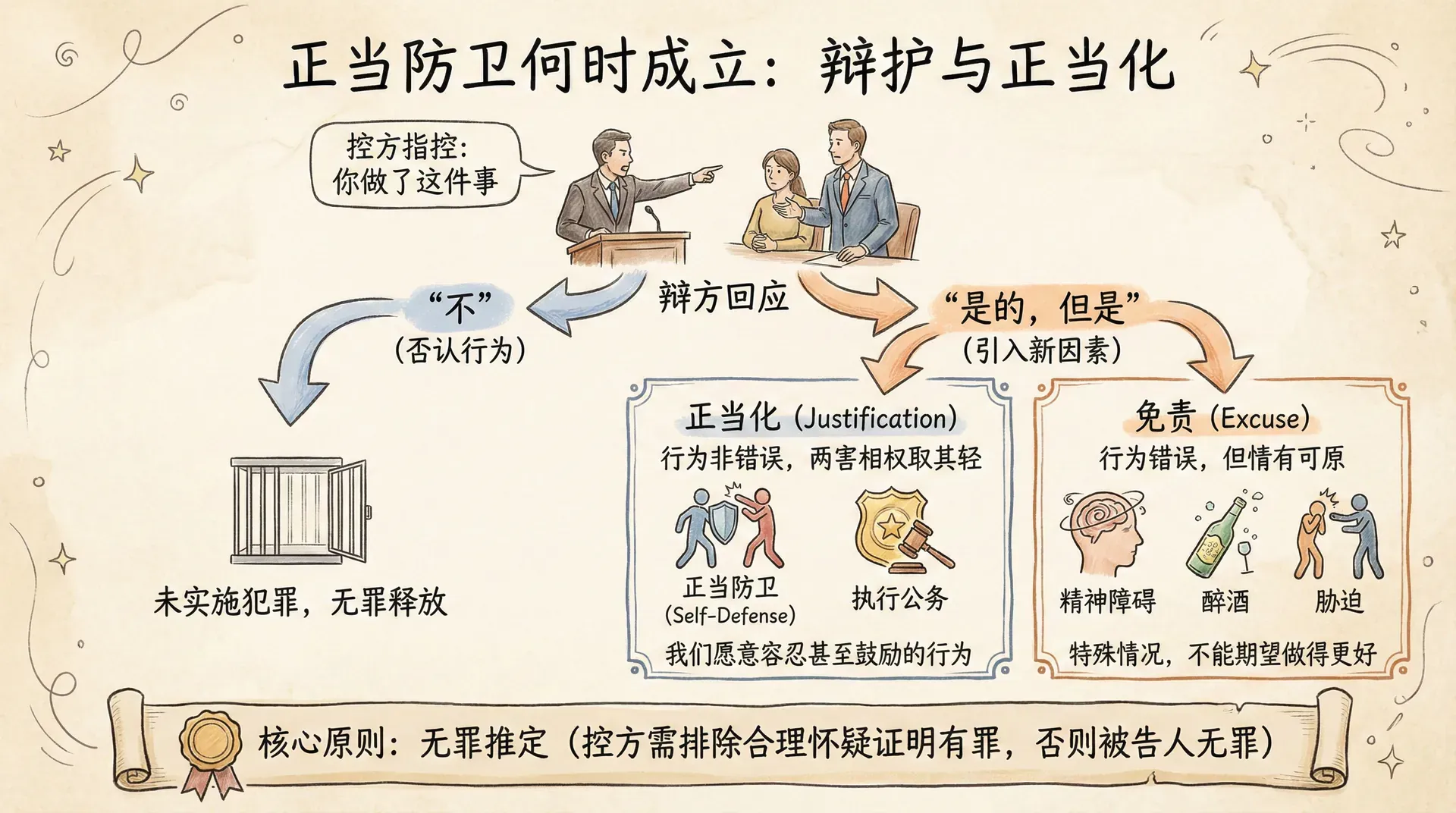 被告人对控方案情的“不”回应本质上意味着被告人没有实施被指控的犯罪。“是的,但是”的回应则不同。辩护方不是反驳控方的主张,而是引入一些新的因素来为被告人开脱。刑法确定了两类“是的,但是”的辩护,即我们可能不想惩罚满足犯罪构成要件的人的理由:正当化与免责。