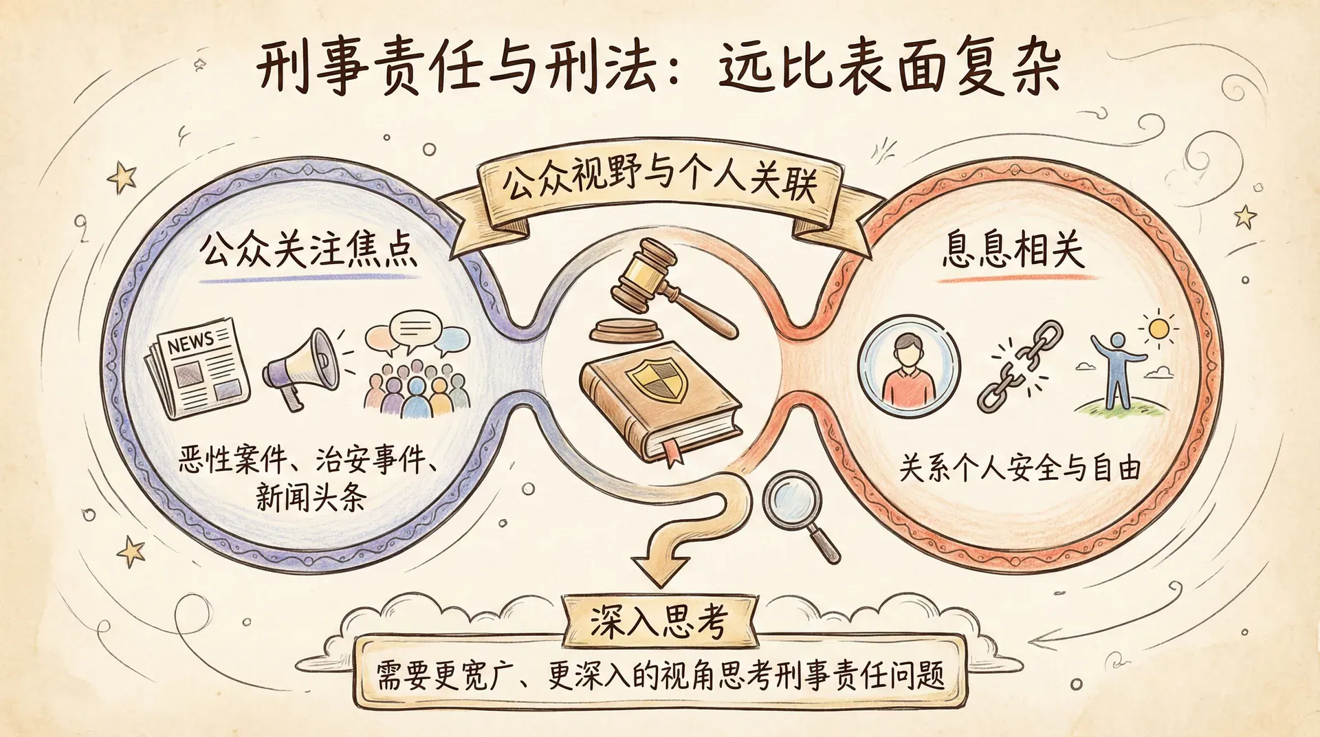 刑法是所有法律领域中最能吸引公众注意力的分支。骇人听闻的恶性案件、充满戏剧性的情感纠葛、街头巷尾的治安事件,无不占据着新闻头条和社会舆论的焦点。刑法也与每个人息息相关,直接关系到个人的安全与自由。然而,刑法问题远比表面看起来复杂得多,需要以更宽广、更深入的视角来思考刑事责任问题。