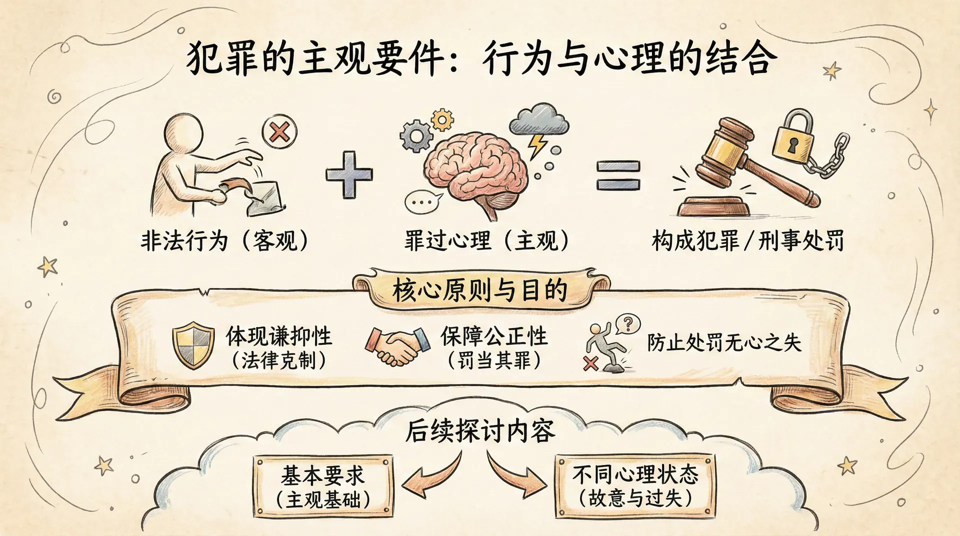 在刑法中,判断一个人是否构成犯罪,不能只看他的行为本身,还要考察其内心的主观心理状态。也就是说,只有当非法行为与一定的“罪过心理”相结合时,法律才认为应受到刑事处罚。这一要求体现了刑法的谦抑性和公正性,防止无心之失被一律处以刑罚。下面我们将详细探讨刑法中对主观要件的基本要求和不同的主观心理状态。