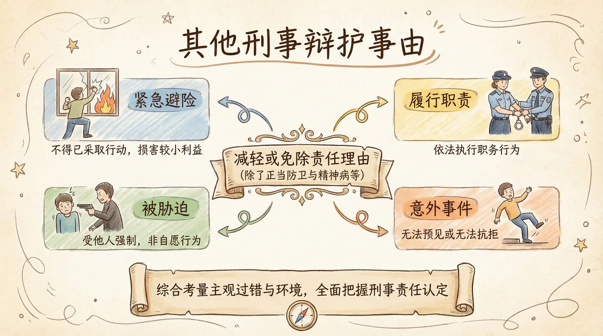 刑法中除了正当防卫与精神病等主要免责事由外,还承认其他多种可以减轻或免除刑事责任的辩护理由。随着社会的发展和法律理论的演进,这些辩护事由不断丰富,反映了法律对行为人主观过错和行为环境的综合考量。理解这些辩护事由有助于更加全面地把握刑法的适用范围和刑事责任的认定标准。