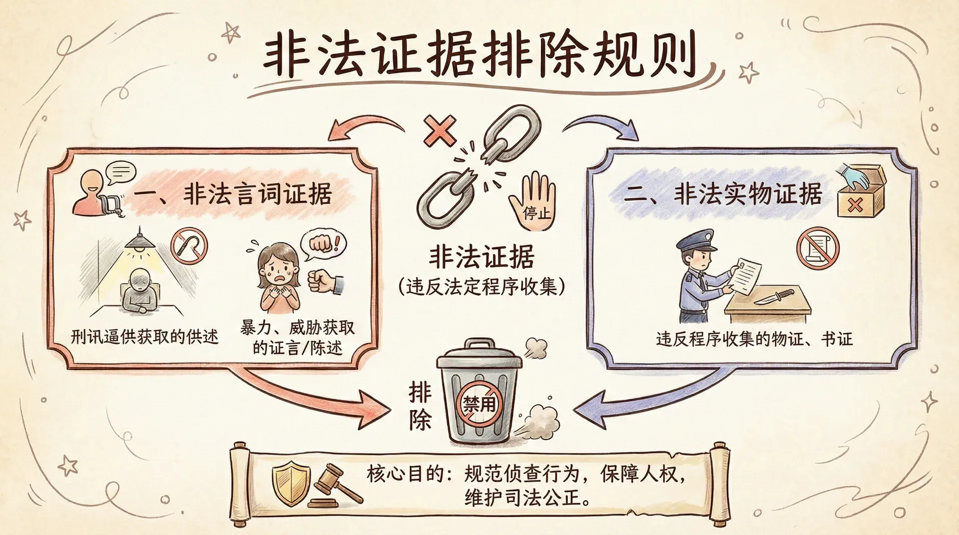 非法证据是指侦查机关违反法定程序收集的证据。根据证据种类的不同,非法证据主要包括两类:一是非法言词证据,即通过刑讯逼供等非法手段获取的犯罪嫌疑人、被告人供述,以及通过暴力、威胁等手段获取的证人证言、被害人陈述;二是非法实物证据,即违反法定程序收集的物证、书证等。