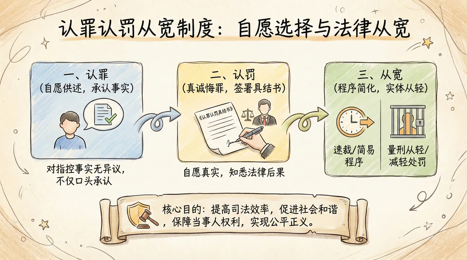 认罪是指犯罪嫌疑人、被告人自愿如实供述自己的罪行,对指控的犯罪事实没有异议,不仅是口头承认,还包括对案件事实和法律定性的认可。如果被告人承认实施了某个行为,但不认为该行为构成犯罪,就不能认定为认罪。认罚是指犯罪嫌疑人、被告人真诚悔罪,愿意接受处罚,在审查起诉阶段,犯罪嫌疑人需要在辩护人或值班律师的见证下签署《认罪认罚具结书》,表明其认罪认罚的意愿是自愿、真实的,并且知悉认罪认罚的法律后果。从宽则体现在程序和实体两个方面:程序上可以适用速裁程序、简易程序等简化审理方式,缩短办案周期;实体上可以在量刑时予以从轻、减轻处罚。