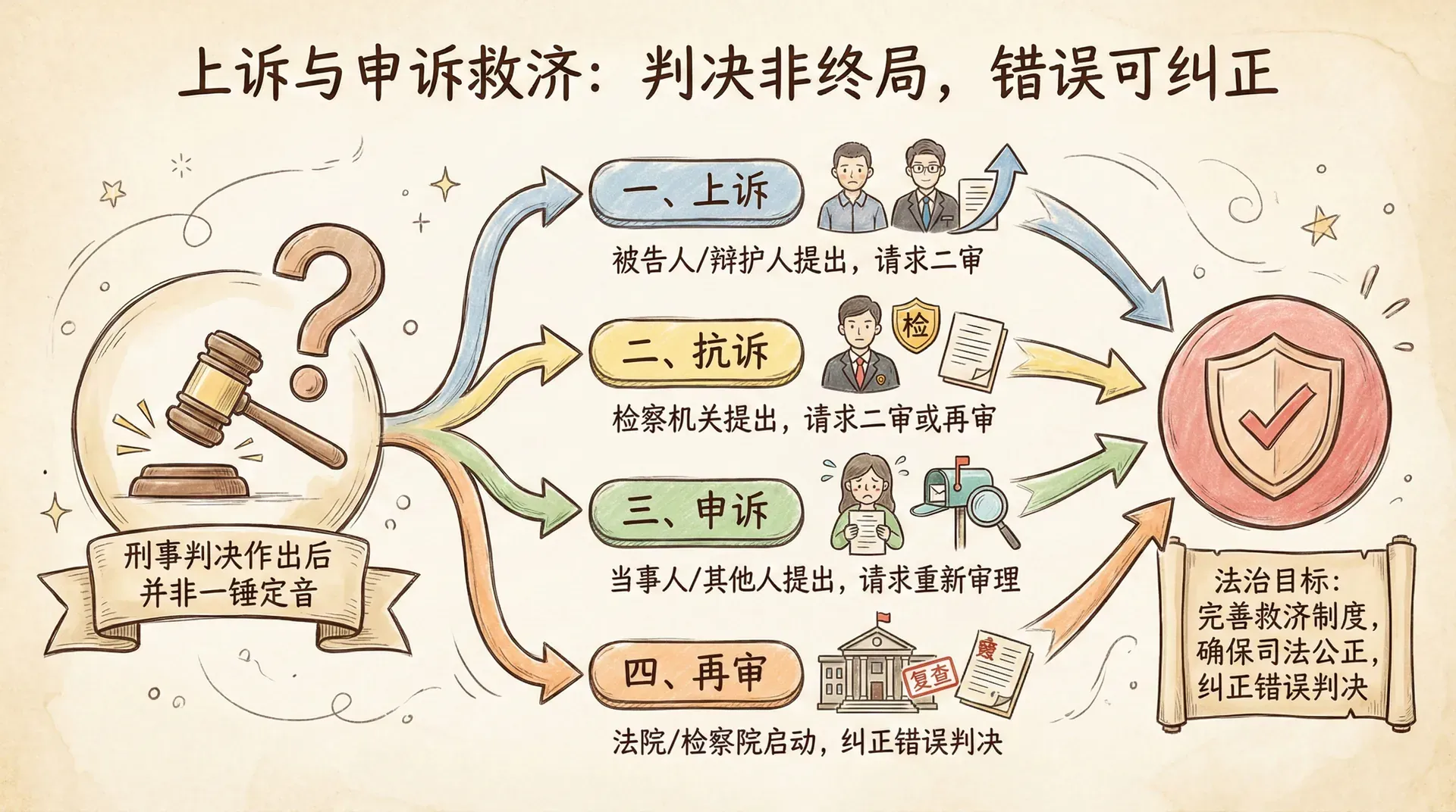 在刑事司法中,为了防止冤错案件和保障当事人的合法权益,判决做出后还设有多种救济途径。我国不仅允许不服判决的被告人依法上诉,还建立了包括抗诉、申诉、再审等较为完善的救济制度。这些制度为判决存在瑕疵或错误时提供了纠正的机会,进一步增强了司法公正和透明,保障了法律的权威和社会的公平正义。