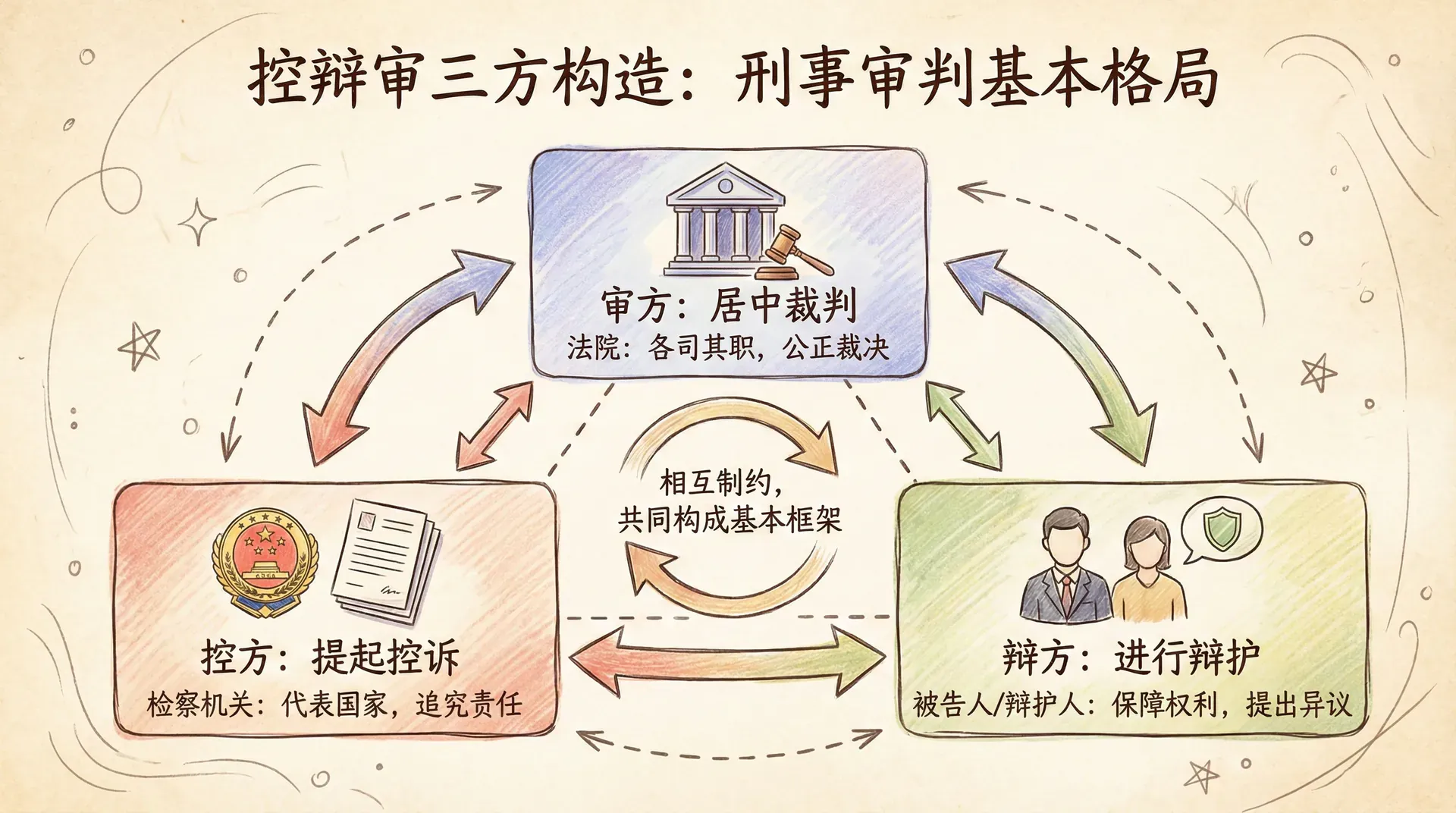 刑事审判的基本格局是控辩审三方构造:检察机关代表国家提起控诉,被告人及其辩护人进行辩护,法院居中裁判。三方各司其职、相互制约,共同构成现代刑事诉讼的基本框架。