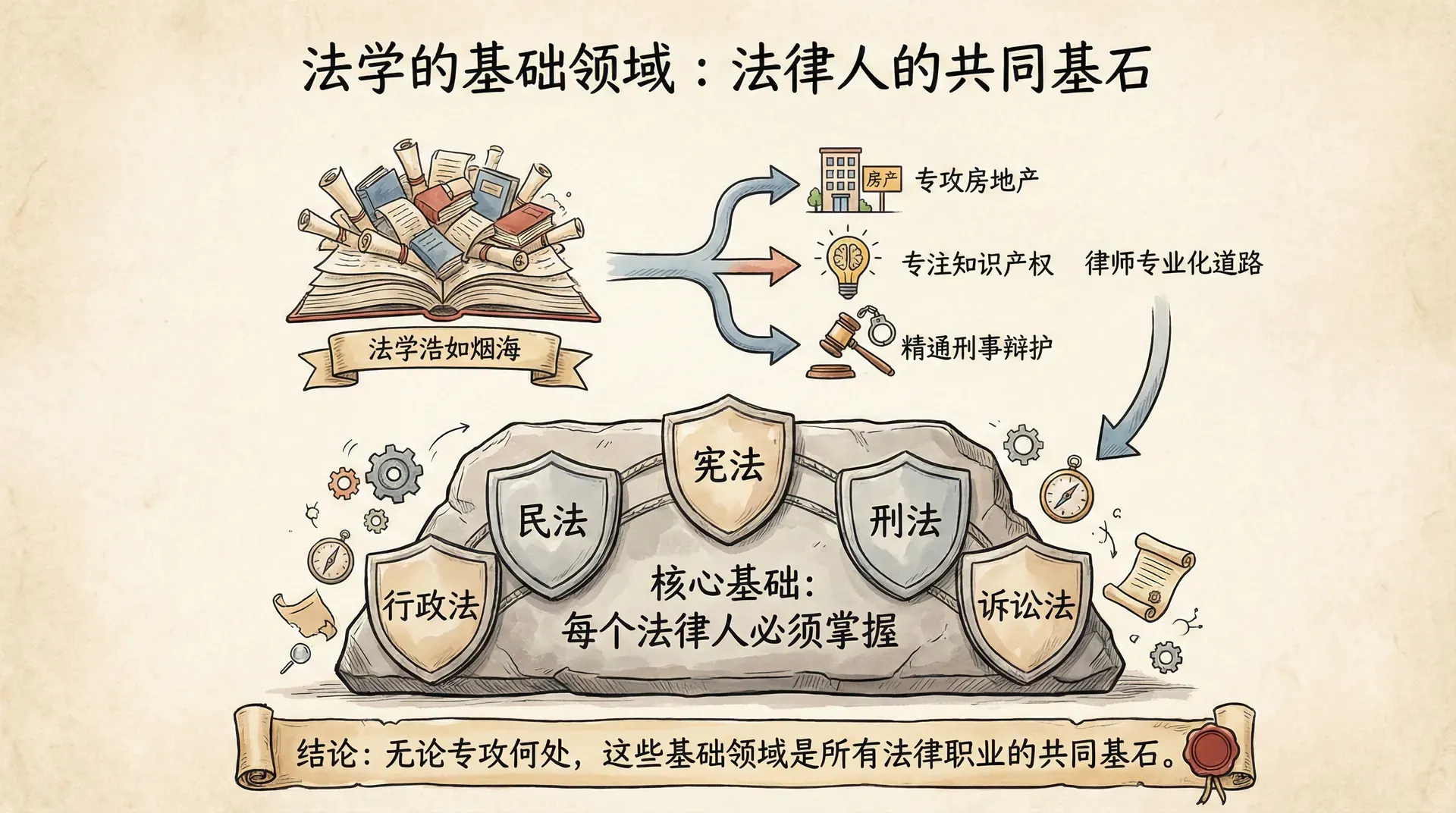 法学浩如烟海,任何人都不可能穷尽所有的法律知识。这也是为什么大多数律师会选择专业化的道路,有的专攻房地产,有的专注知识产权,有的精通刑事辩护。但无论走哪条路,都有一些基础领域是每个法律人必须掌握的。