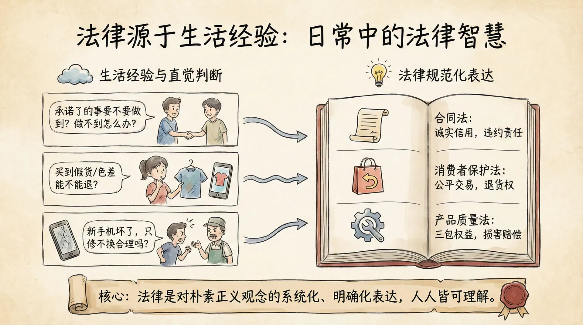 法律本质上是对生活经验的提炼和规范化表达。合同法关心的问题,其实就是我们日常生活中经常遇到的:承诺了的事要不要做到?做不到怎么办?买到假货能不能退?这些问题,每个人都有自己的直觉和判断,法律不过是把这些判断系统化、明确化罢了。你答应朋友周末帮他搬家,但临时有急事去不了,朋友能要求你赔偿吗?你在网上买了一件衣服,收到后发现颜色和图片差别很大,能不能要求退货?新买的手机用了一个月就坏了,商家只愿意维修不愿意换新,这合理吗?这些日常困惑,正是合同法、消费者保护法要解决的问题。法律的很多原则,比如“诚实信用”“公平交易”“损害赔偿”,本质上都是对朴素正义观念的表达。你未必知道这些概念的法律定义,但一定能理解其中的道理。