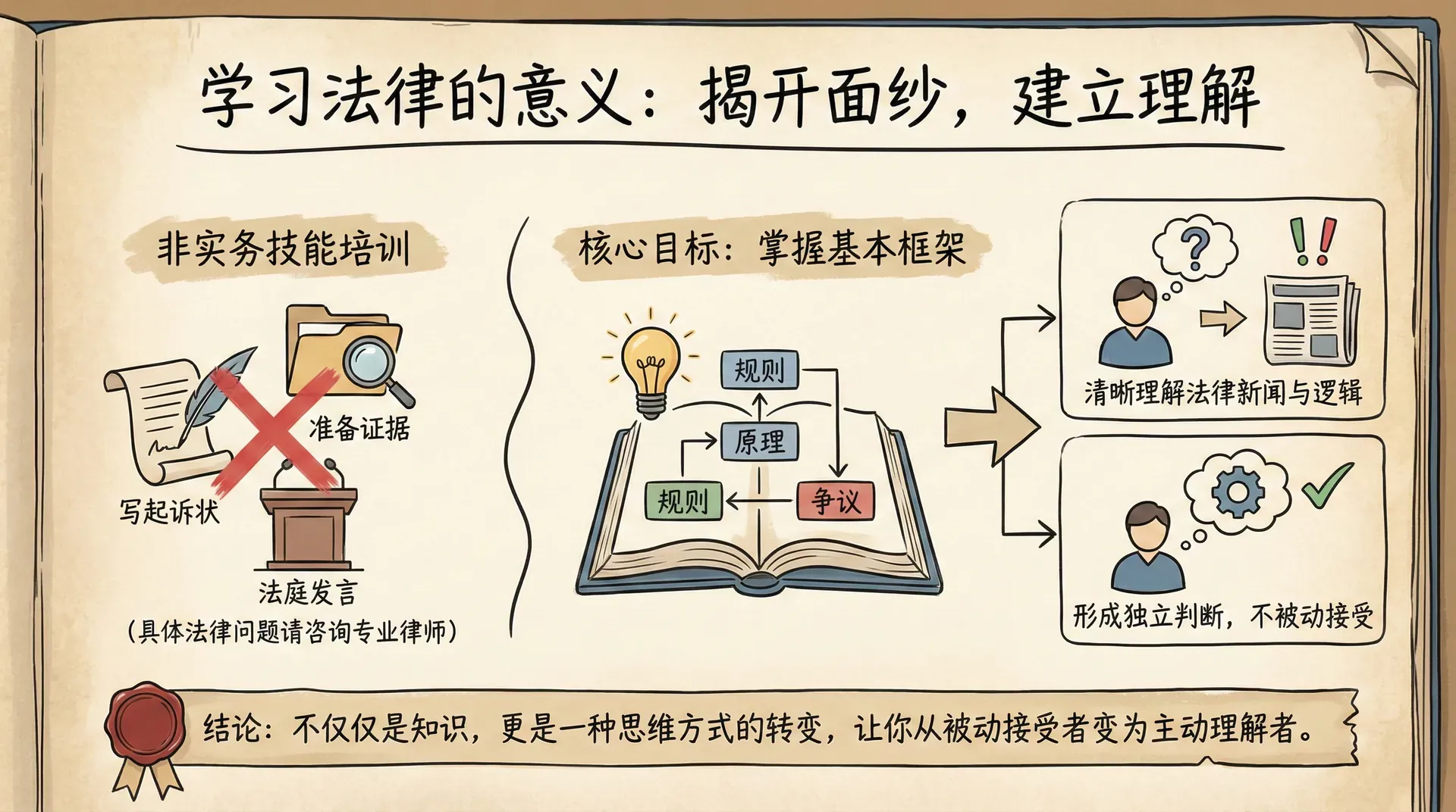 这里不会教你如何打官司——怎么写起诉状、怎么准备证据、怎么在法庭上发言。那些实务技能需要专业培训和实践积累,如果你有具体的法律问题需要处理,还是应该咨询专业律师。但这里会给你一些更重要的东西:对法律的基本理解。当你掌握了法律的基本框架,再去咨询律师或者阅读法律新闻时,你会更清晰地理解那些专业术语和法律争议。你会明白为什么有些案件引发了如此大的社会争论,你会理解法官判决背后的逻辑和考量。更重要的是,你会开始形成自己对这些问题的判断,而不是只能被动接受专家的结论。