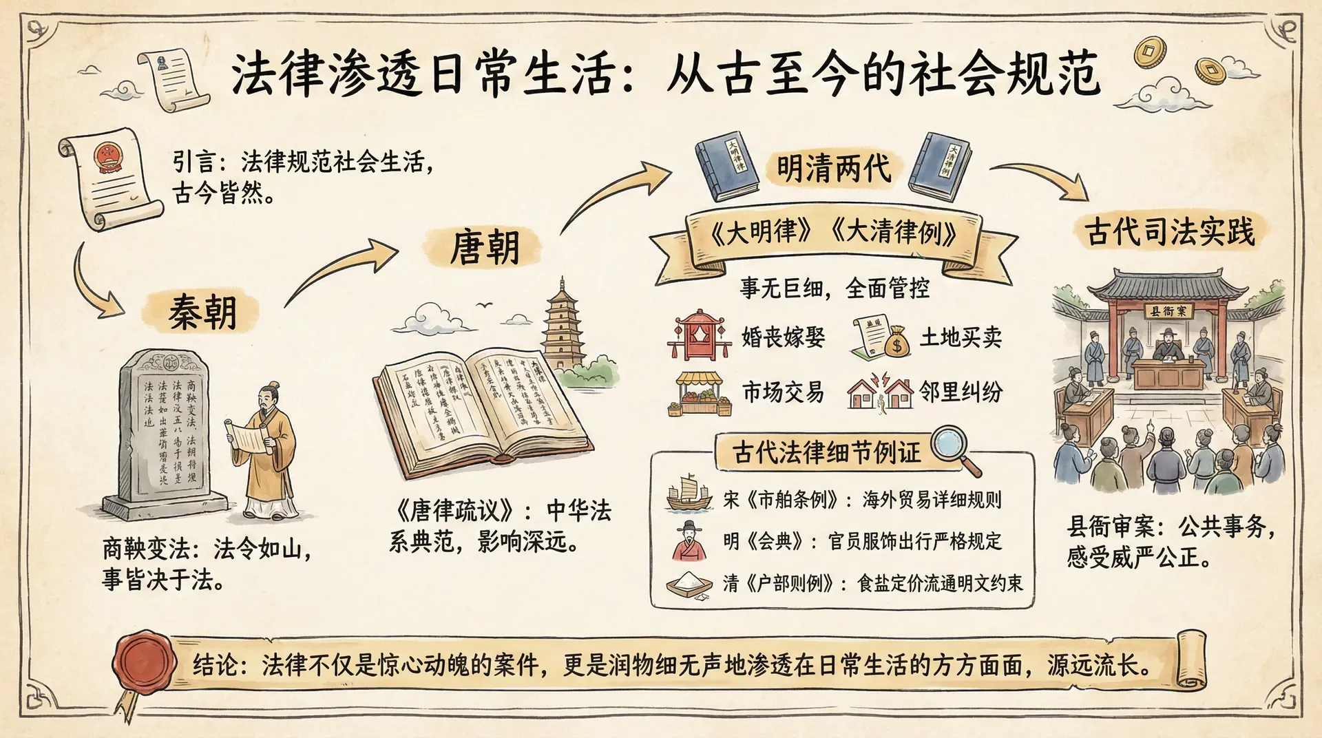 我们有着悠久的法律传统。两千多年前的秦朝,商鞅就推行了严密的法律制度,“法令如山,事皆决于法”。到了唐朝,《唐律疏议》成为中华法系的典范之作,其影响远及周边国家。明清两代,《大明律》和《大清律例》详尽规定了社会生活的方方面面,从婚丧嫁娶到土地买卖,从市场交易到邻里纠纷,几乎无所不包。古代的法律对日常生活的管控,其实比今天还要细致——宋代的《市舶条例》规定了海外贸易的详细规则,明代的《会典》对官员的服饰、出行都有严格规定,清代的《户部则例》甚至对食盐的定价和流通都有明文约束。在古代社会,诉讼也是重要的公共事务,县衙审案往往引来围观,人们在旁听中感受着法律的威严与公正。